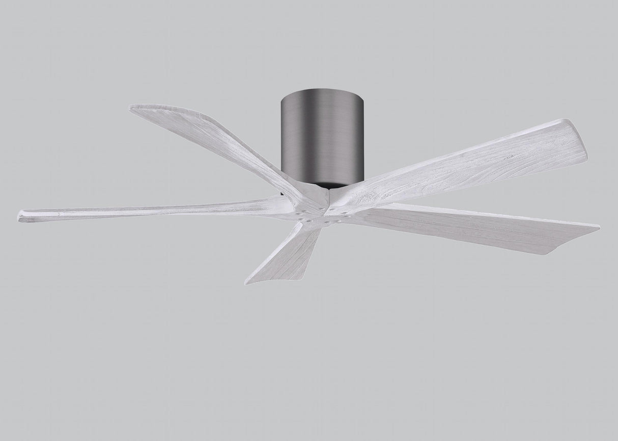Matthews Fan IR5H-BP-MWH-52 Irene-5H five-blade flush mount paddle fan in Brushed Pewter finish with 52” solid matte white wood blades.