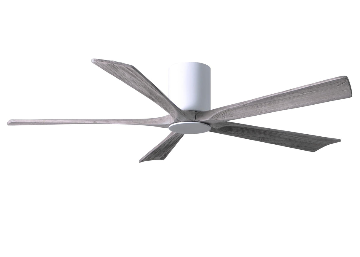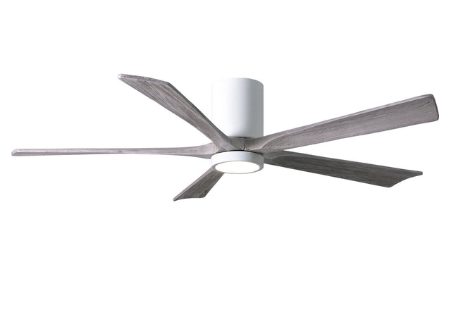 Matthews Fan IR5HLK-WH-BW-60 IR5HLK five-blade flush mount paddle fan in Gloss White finish with 60” solid barn wood tone blades and integrated LED light kit.