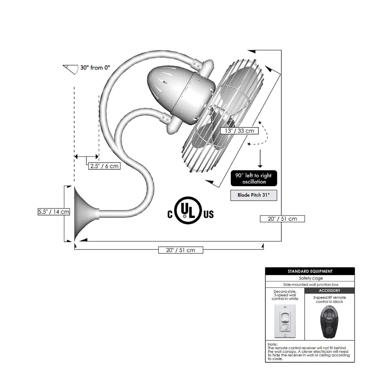 The oscillating Melody, 3–speed wall-mounted fan, designed in the Art Nouveau style with a grand, arching gooseneck, provides maximum multi-directional airflow with its 90° left to right sweep. Melody can be mounted in small, awkward spaces or in front of HVAC ducts to improve the efficiency of the heating, ventilation or air conditioning of any space. Constructed of cast aluminum and heavy stamped steel, the Melody carries a limited lifetime warranty.