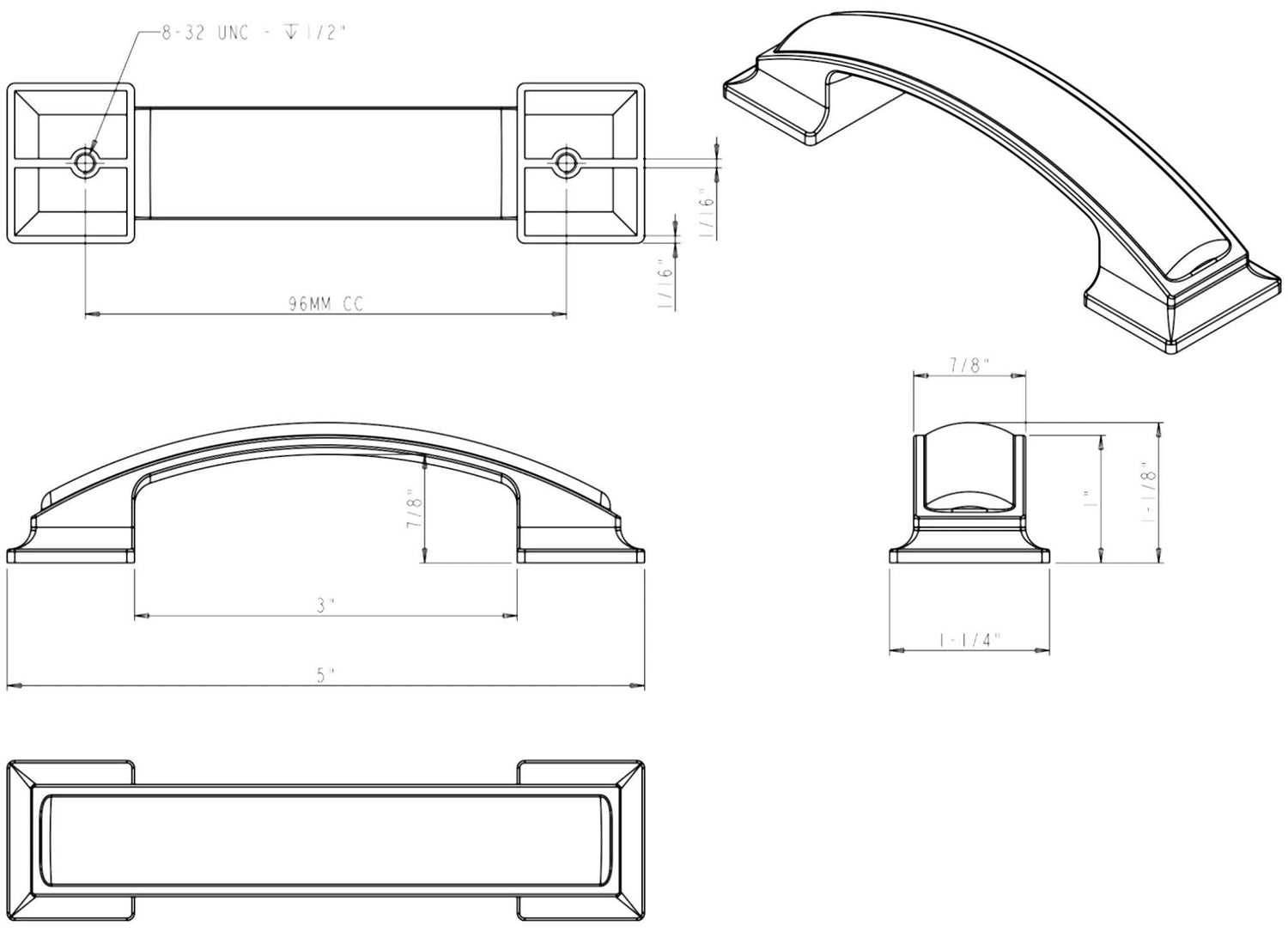 5" Overall Length Pillow Top Cabinet Pull. Holes are 96 mm center-to-center. Packaged with two 8-32 x 1" and two Break-away screws. Finish: Brushed Pewter