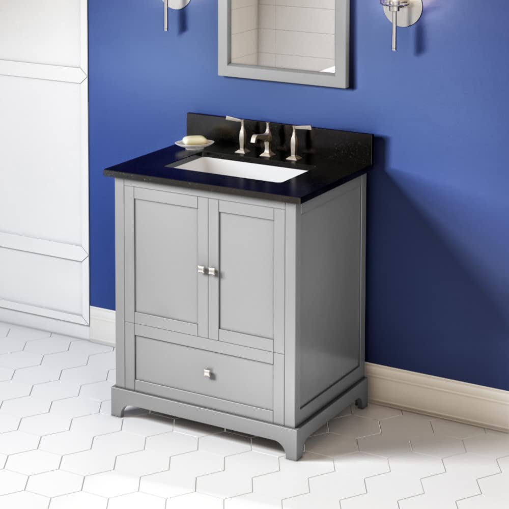 Jeffrey Alexander VKITADD30GRBGR 30" Grey Addington Vanity, Black Granite Vanity Top, undermount rectangle bowl