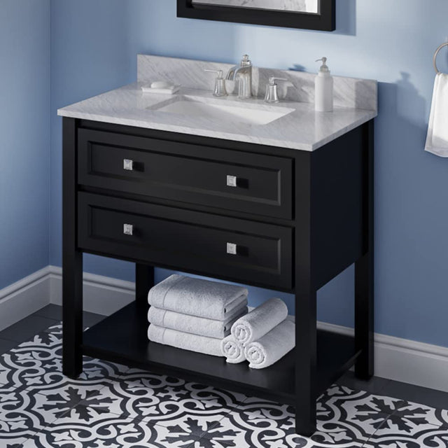 Jeffrey Alexander VKITADL36BKWCR 36" Black Adler Vanity, White Carrara Marble Vanity Top, undermount rectangle bowl