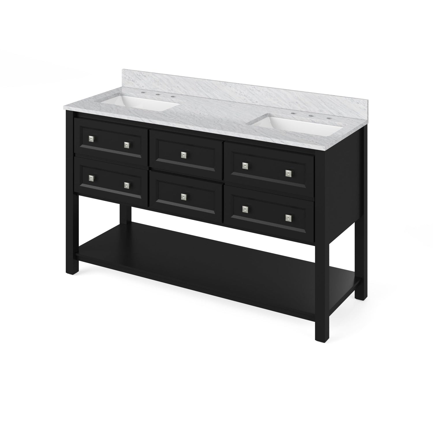 Sleek square legs, an open bottom shelf, and the classic Shaker design create a perfect blend of style and function. This vanity includes two full cabinets, two soft-close full-extension center drawers, and an open bottom shelf to accentuate the bath with storage solutions. The White Adler vanity is adorned with Satin Nickel knobs from Jeffrey Alexander's Modena collection. Vanity measurements: 60" W x 21-1/2" D x 35" H. This 61" Steel Grey Cultured Marble vanity top is designed to fit 60" double bowl vanities. Small bits of white and grey merge into a neutral salt-and-pepper finish. This neutral grey is spread evenly throughout, creating an ideal surface. The two cutouts are sized to fit our undermount rectangle vanity bowls. Above each cutout are three holes that are cut for an 8” widespread faucet. A 4” tall backsplash is included. This vanity top is designed to overhang ½" on each side and in front of the vanity. Top measurements: 61" W x 22" D x 25 mm H. Backsplash dimensions: 61" W x 25 mm D x 4" H. Some assembly required. Faucet not included.