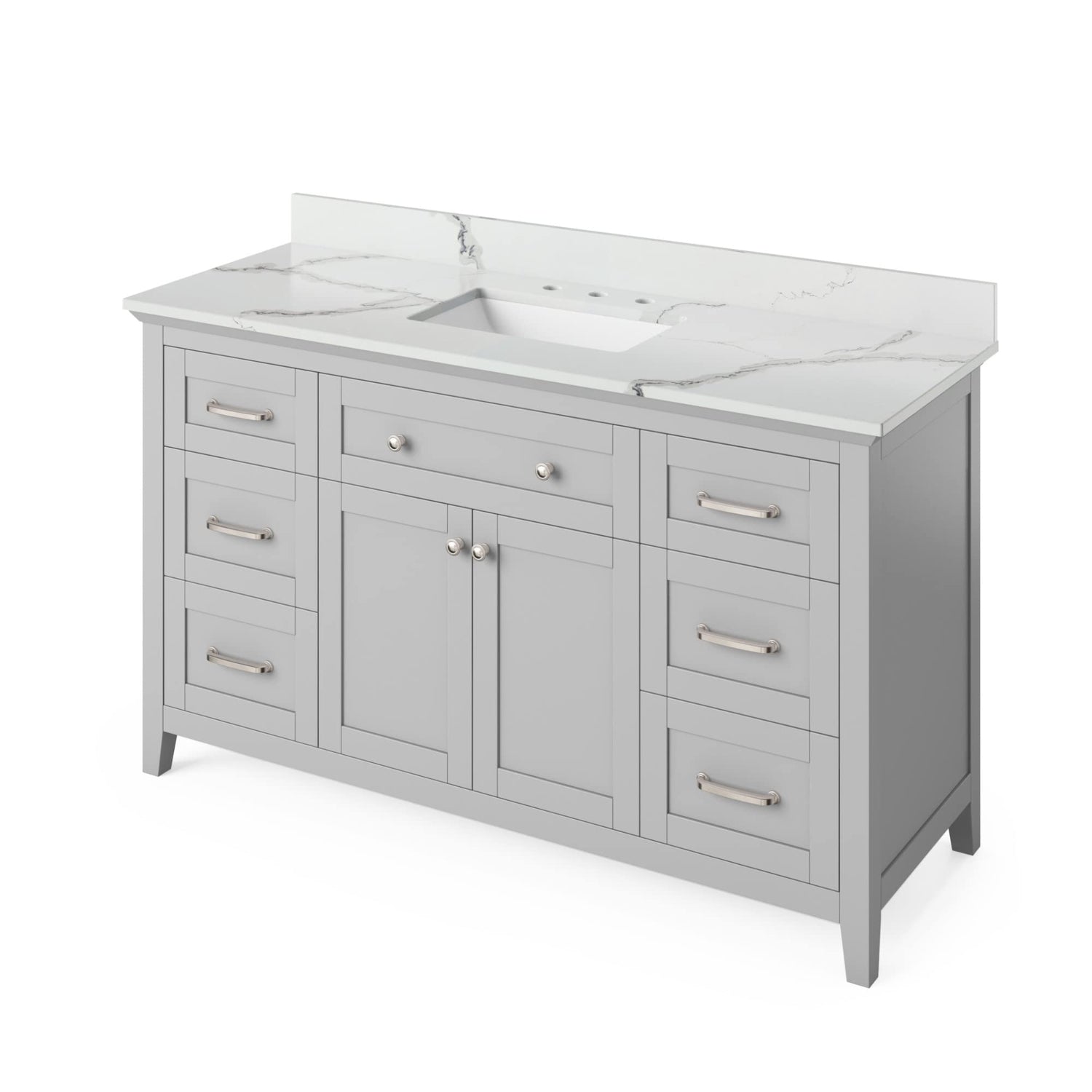 The Chatham vanity collection embraces the classic Shaker style with refined elegance. Our popular Chatham collection is available in a diverse selection of colors and sizes that provide a variety of options. This unit is equipped with a solid wood, custom-sized tipout storage tray under the single centered bowl. A hardwood rollout drawer with full-extension soft-close undermount slides is situated beneath the adjustable shelf in the cabinet. Additional storage is provided by three dovetail drawers on either side of the cabinet. This White vanity is adorned with Jeffrey Alexander's Cordova knobs and Bremen 1 pulls in Satin Nickel. All slides and hinges are soft-close. Vanity measurements: 60" W x 21-1/2" D x 35" H. This 61" Boulder Cultured Marble vanity top is designed to fit 60" center bowl vanities. Grey mid-tones and flecks of white blend to create a warm, deep grey visual texture that is reminiscent of majestic boulders glistening in the bright sun. The center rectangle cutout is sized to fit our undermount rectangle vanity bowl. Three holes are cut for an 8" widespread faucet, and a 4" tall backsplash is included. This vanity top is designed to overhang ½" on each side and in front of the vanity. Top measurements: 61" W x 22" D x 25 mm H. Backsplash dimensions: 61" W x 25 mm D x 4" H. Some assembly required. Faucet not included.
