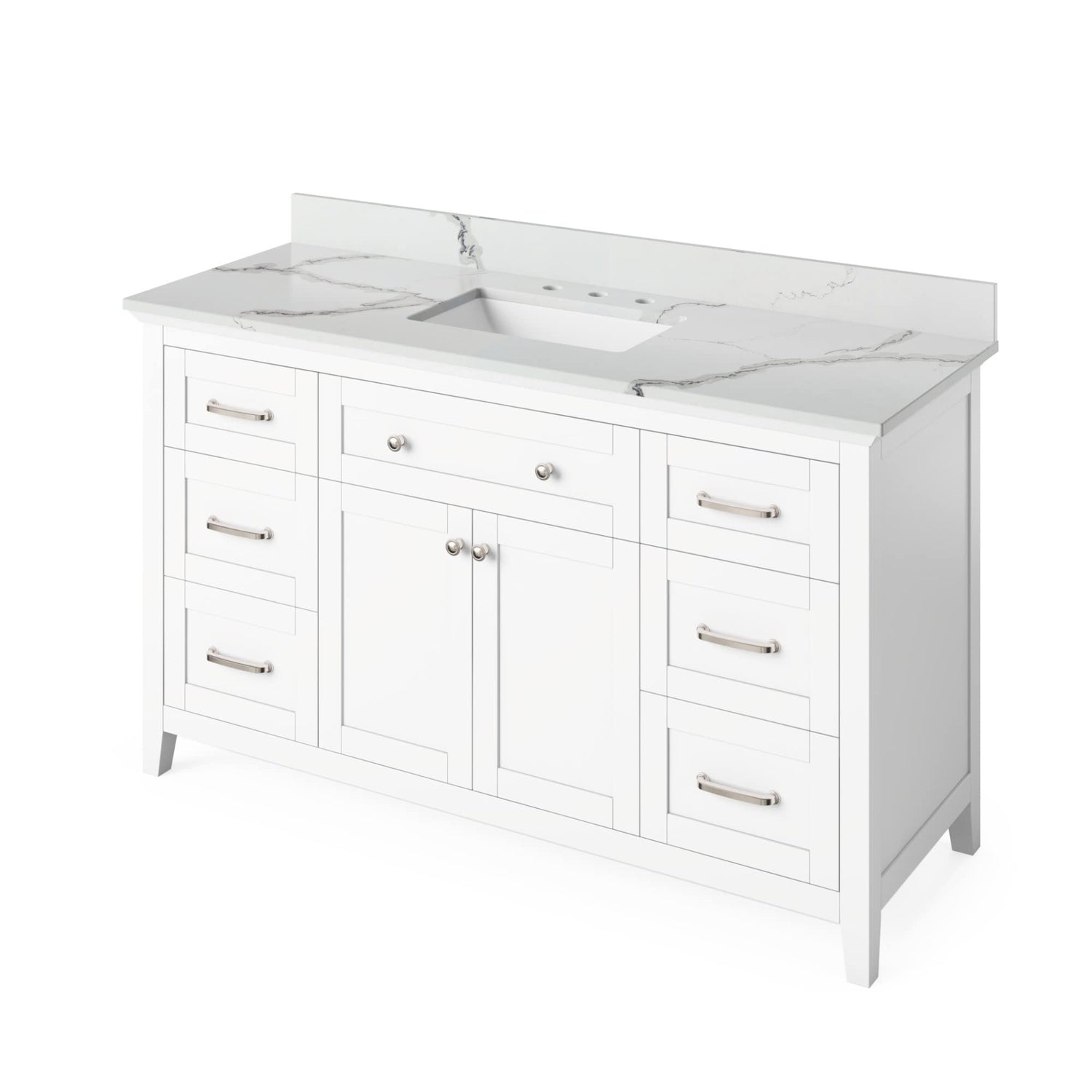 The Chatham vanity collection embraces the classic Shaker style with refined elegance. Our popular Chatham collection is available in a diverse selection of colors and sizes that provide a variety of options. This unit is equipped with a solid wood, custom-sized tipout storage tray under the single centered bowl. A hardwood rollout drawer with full-extension soft-close undermount slides is situated beneath the adjustable shelf in the cabinet. Additional storage is provided by three dovetail drawers on either side of the cabinet. This White vanity is adorned with Jeffrey Alexander's Cordova knobs and Bremen 1 pulls in Satin Nickel. All slides and hinges are soft-close. Vanity measurements: 60" W x 21-1/2" D x 35" H. This 61" White Carrara Marble vanity top is designed to fit 60" center bowl vanities. White Carrara Marble is a timeless natural stone that creates a neutral clean space. Dark grey veining undulates throughout the stone as it weaves its way across the surface The center rectangle cutout is sized to fit our undermount rectangle vanity bowl. Three holes are cut for an 8" widespread faucet, and a 4" tall backsplash is included. This vanity top is designed to overhang ½" on each side and in front of the vanity. Top measurements: 61" W x 22" D x 25 mm H. Backsplash dimensions: 61" W x 25 mm D x 4" H. Some assembly required. Faucet not included.