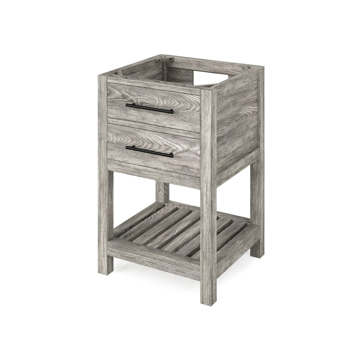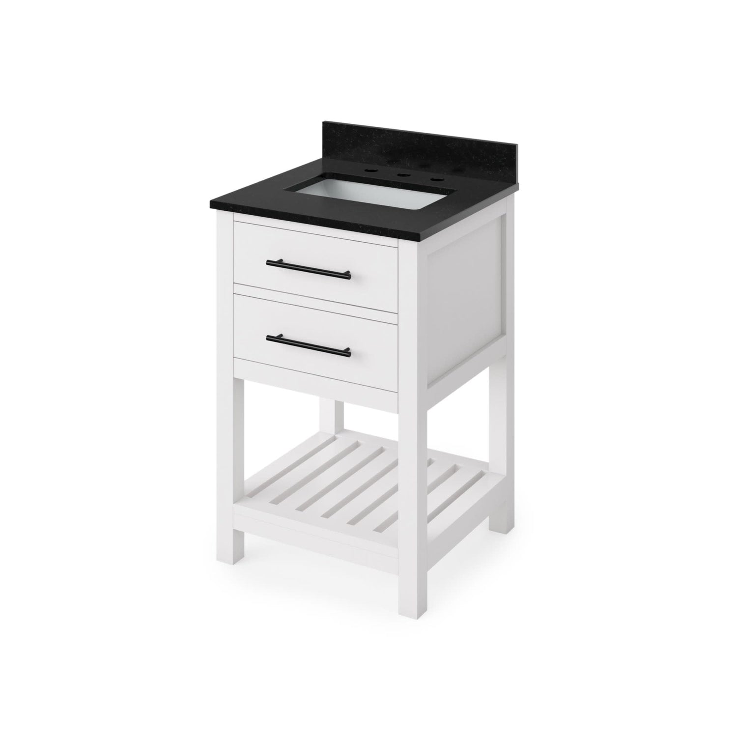 Escape to the seaside with the Wavecrest vanity collection. Crisp, clean edges and a slatted bottom shelf evoke a coastal calm feeling. The top drawer front is transformed into hidden tipout storage space with a solid hardwood, custom-sized tipout tray. Beneath the tipout storage is a solid hardwood dovetail drawer with full-extension concealed soft-close undermount slides. This White vanity is adorned with Jeffrey Alexander Key West pulls in trendy Matte Black. Vanity measurements: 24" W x 21-1/2" D x 35" H. This 25" Black Granite vanity top is designed to fit 24" center bowl vanities. Golden flecks bring out the natural elements of this polished black surface. Granite is still a trending countertop material and a great option for bathrooms. The center rectangle cutout is sized to fit our undermount rectangle vanity bowl. Three holes are cut for an 8" widespread faucet, and a 4" tall backsplash is included. This vanity top is designed to overhang ½" on each side and in front of the vanity. Top measurements: 25" x 22" x 25 mm. Backsplash dimensions: 25" x 25 mm x 4". Some assembly required. Faucet not included.