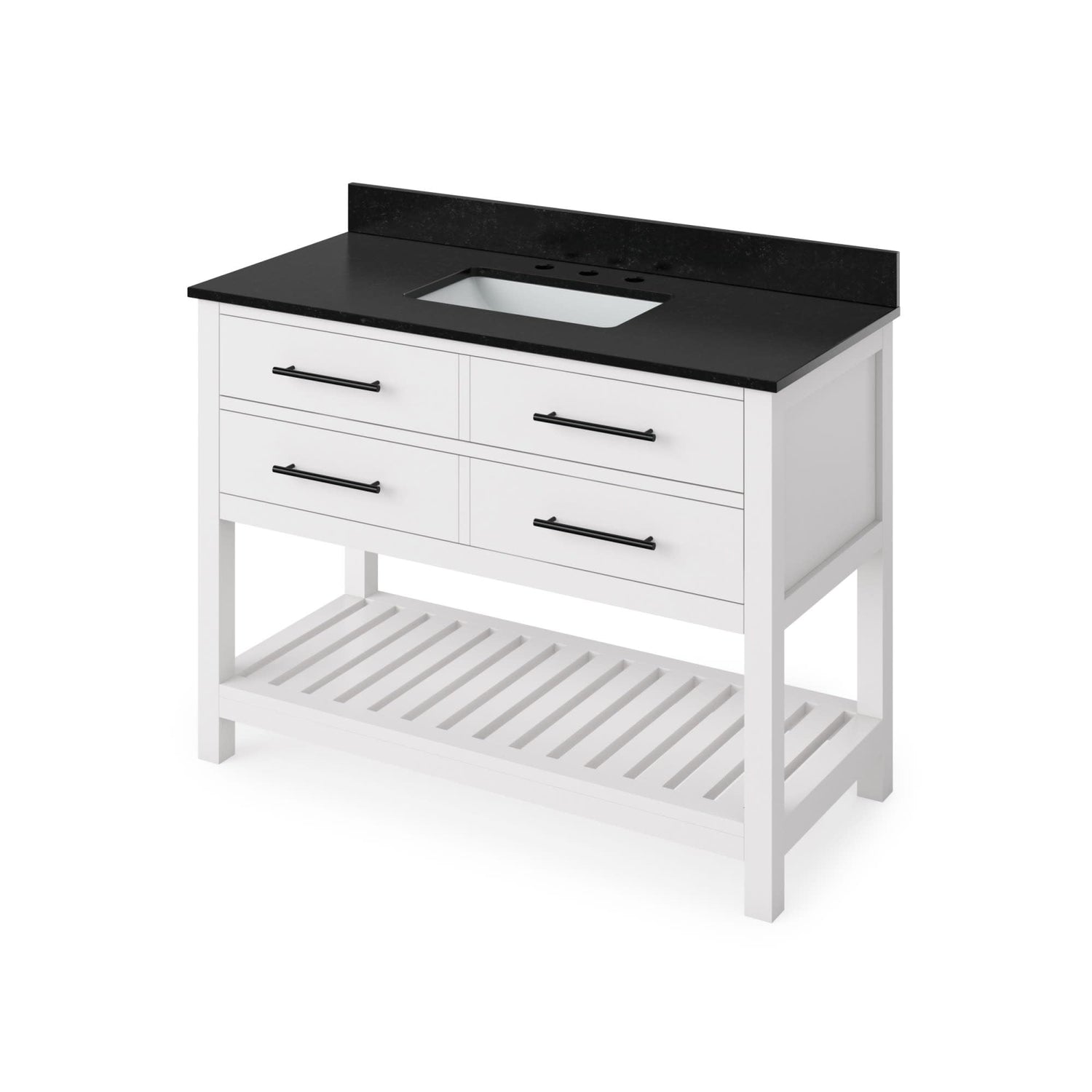 Escape to the seaside with the Wavecrest vanity collection. Crisp, clean edges and a slatted bottom shelf evoke a coastal calm feeling. The top drawer fronts are transformed into hidden tipout storage space, each with a solid hardwood custom-sized tipout tray. Beneath the tipout storage are solid hardwood dovetail drawers with full-extension concealed soft-close undermount slides. This White vanity is adorned with Jeffrey Alexander Key West pulls in trendy Matte Black. Vanity measurements: 48" W x 21-1/2" D x 35" H. This 49" Black Granite vanity top is designed to fit 48" center bowl vanities. Golden flecks bring out the natural elements of this polished black surface. Granite is still a trending countertop material and a great option for bathrooms. The center rectangle cutout is sized to fit our undermount rectangle vanity bowl. Three holes are cut for an 8" widespread faucet, and a 4" tall backsplash is included. This vanity top is designed to overhang ½" on each side and in front of the vanity. Top measurements: 49" x 22" x 25 mm. Backsplash dimensions: 49" x 25 mm x 4". Some assembly required. Faucet not included.