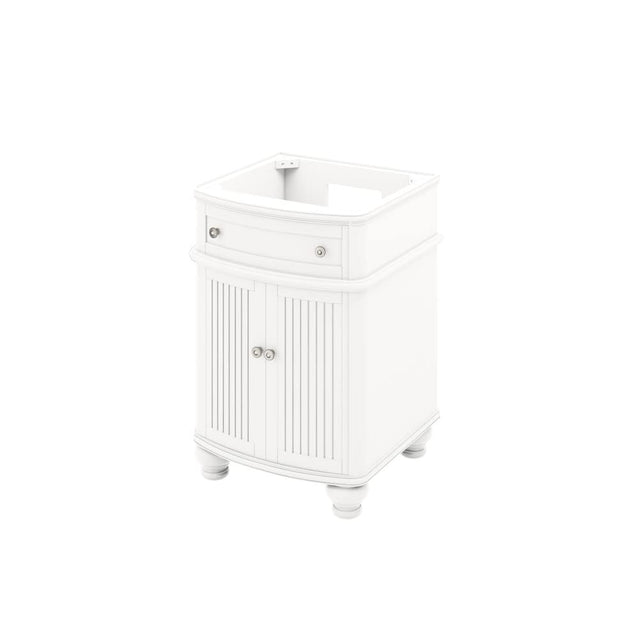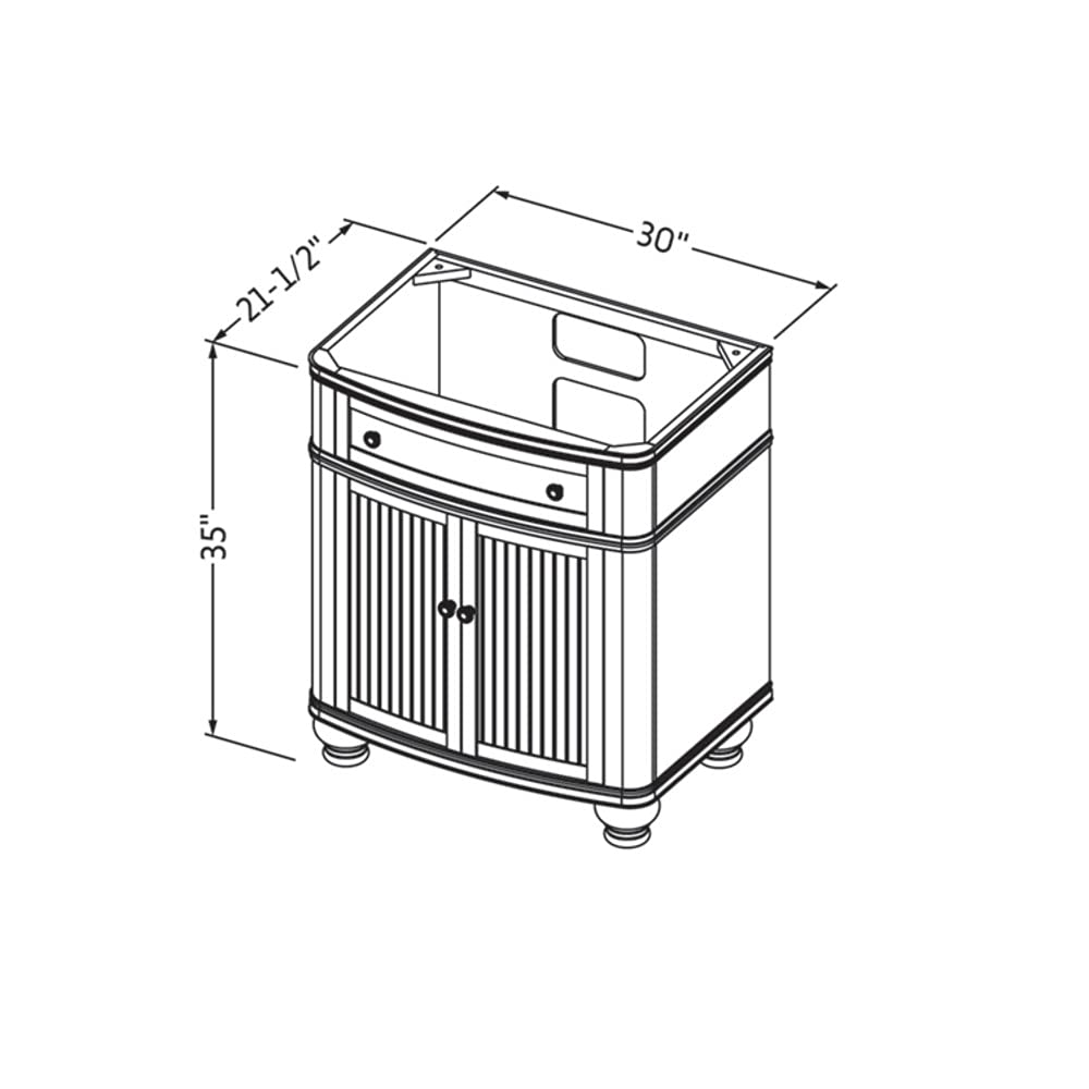 Simple beadboard doors, curved bun feet, and a rounded front form this cottage-style vanity collection. Transform any space with the Walnut or White finish to create a focal point that fits your style. An adjustable shelf is positioned in the cabinet for optimal storage. Walnut vanities are adorned with Jeffrey Alexander's Bremen knobs in Antique Brass. Overall measurements: 30" W x 21-1/2" D x 35" H. The available top materials for Compton are 31" White Carrara Marble and 31" Black Granite. Both are designed specifically for the Compton collection and are available with oval or rectangle bowl cutouts. Top and bowl sold separately.
