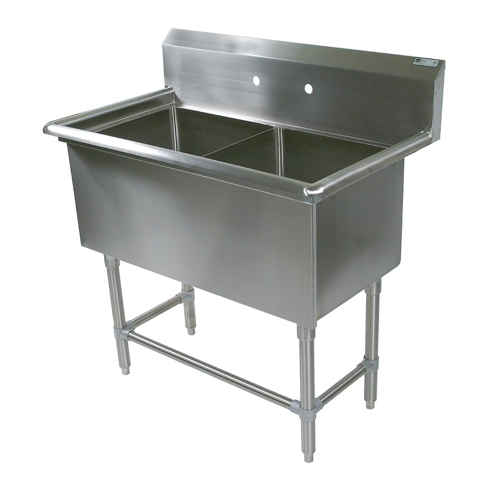 Stainless Steel Two Compartment Sink w/10in. Backsplash37.125in. W x 23.5in. D Two 16" wide x 18" fnt-to-bck x 12" dp comp'ts10"H boxed backsplash w/45 top & 2" returnOne set of faucet holes16/304 Stainless Steel1-5/8" OD galvanized steel legs w/1-1/4" OD adj. side & rear bracingFully welded front apronAdj. galvanized steelfeet Standard 16 Gauge Type 300 stainless steel with # 3 polish, satin finish 12" Deep Bowls All Corners, both vertical and horizontal, coved at 5/8" radius Bottoms of bowls formed for drainage to 3-1/2" diameter die stamped opening Full length 10" High Boxed Backsplash, with 2" return to wall at 45 degree and 3/4" turned down rear lip 1-1/2" Faucet Holes in Backsplash Solid Stainless Steel front panel, type 300 stainless steel with # 3 polish, satin finish All outside corners of assembly are Bullnosed to provide safe,clean and polished edge Standard legs 1-5/8" diameter, 16 gauge galvanized steel 100% pre-galvanized steel - Not Plated Legs located directly under sink bowls, providing increased stability and maximum weight support 2-16X18 W/NO DB 16GA