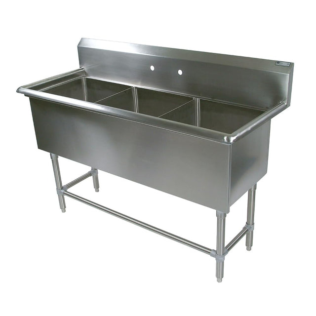 Sink (3) 16" wide x 18" fnt-to-bck x 12" dp comp'ts 10"H boxed backsplash w/45 top & 2" return (2)sets faucet holes 16/304 s/s 1-5/8" OD galv. legs w/1-1/4" OD adj. side & rear bracing Fully welded front apron & adj. galv. feetFEATURES: * Standard 16 Gauge (optional 14 gauge) Type 300 stainless steel with # 3 polish, satin finish * 12" Deep Bowls (optional 14" deep bowls) * All Corners, both vertical and horizontal, coved at 5/8" radius 2* Bottoms of bowls formed for drainage to 3-1/2" diameter die stamped opening * Full length 10" High Boxed Backsplash, with 2" return to wall at 45 degree and 3/4" turned down rear lip * 1-1/2" Faucet Holes in Backsplash* Solid Stainless Steel front panel, type 300 stainless steelwith # 3 polish, satin finish* All outside corners of assembly are Bullnosed toprovide safe,clean and polished edge* Standard legs 1-5/8" diameter, 16 gauge galvanized steel100% pre-galvanized steel - Not Plated (optional stainless steel) 16" X 18" 18" X 24"* Legs located directly under sink bowls, providing increased 16" X 20" 24" X 24"stability and maximum weight support 18" X 18" 30" X 24"CONSTRUCTION:Top: Stainless Steel Sinks are TIG welded, Exposed welds are polished to match adjacent surface.Bases: Galvanized Bases are MIG welded MATERIAL: 14" Bowls & 16 gauge stainless Steel (optional 14 Gauge) Top: Type 300 stainless steel with # 3 polish, satin finish Legs: 1 5/8" Round O.D., 16 gauge galvanized steel 100% pre-galvanized steel - Not Plated Bracing: 1 1/4" Round O.D., 16 gauge galvanized steel 100% pre-galvanized steel - Not Plated Gussets: Stainless SteelFeet: 1" adjustable galvanized bullet feet 3-16X18X12 W/NO DB 16GA