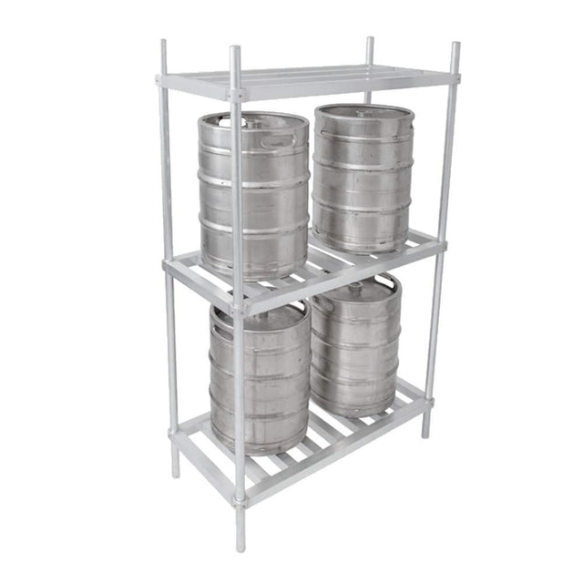 John Boos' Keg Rack, 42"W x 20"D x 76"H, (3) shelves, accommodates (4) kegs, mid & bottom shelves are constructed of 1-3/4" square tubing running front-to-back with a load rating of 60 lb/ft², top shelf is constructed of 1-3/4" square tubing running left-to-right with a load rating of 15 lb/ft², 1-5/16" dia. post, aluminum construction. ALUMINUM KEG RACK 42X20X76