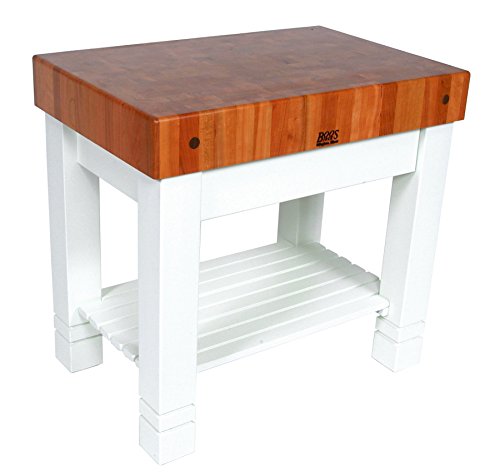 John Boos Homestead Block CHY-HMST26245. 5"-thick cherry end-grain butcher block. 36" x 24" x 34 in. high. Painted alabaster base. Utensil drawer in table apron. CHERRY HOMESTEAD BLOCK 36X24X5 ALAB