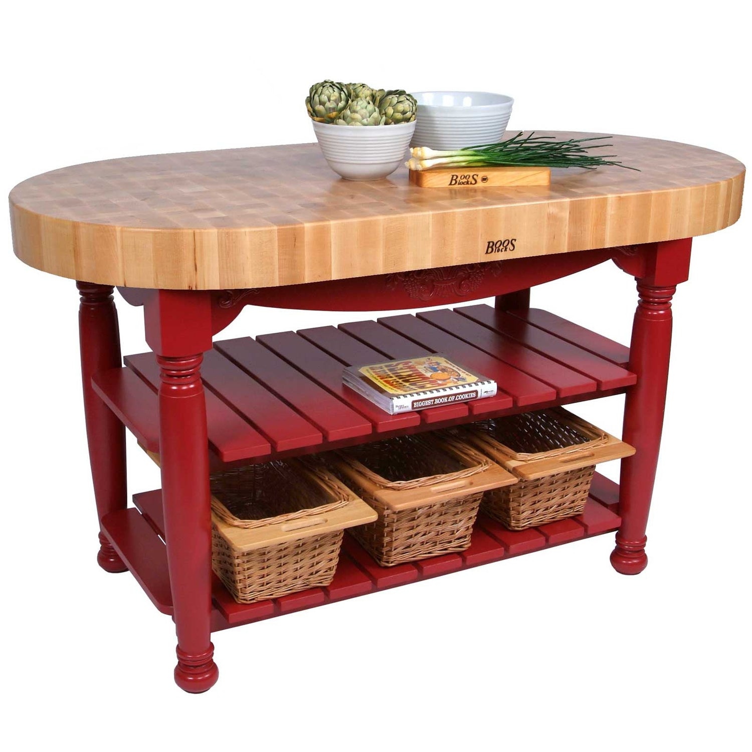 John Boos Harvest Table. 60 x 30 in. oval, 36 in. high. Maple End-Grain butcher block top 4 in. thick. 3 wicker baskets. Table base comes in 13 colors. HARVST TBL 60X30X4 ALABASTER