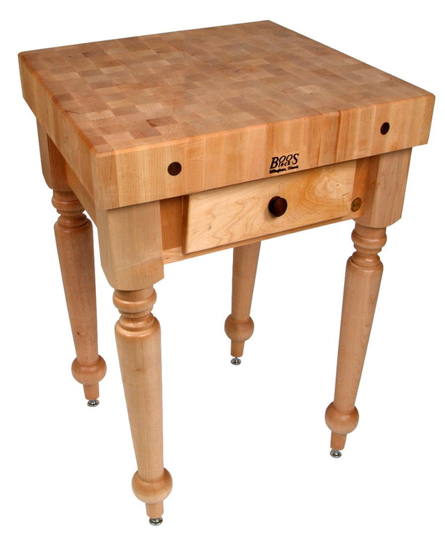 John Boos Cucina Rustica butcher block table, Model CUCR. Features a 4-in.-thick end-grain maple butcher block. 1 or 2 dovetailed drawers, depending on size. RUSTICA 48X24X4 CRM ALABASTER
