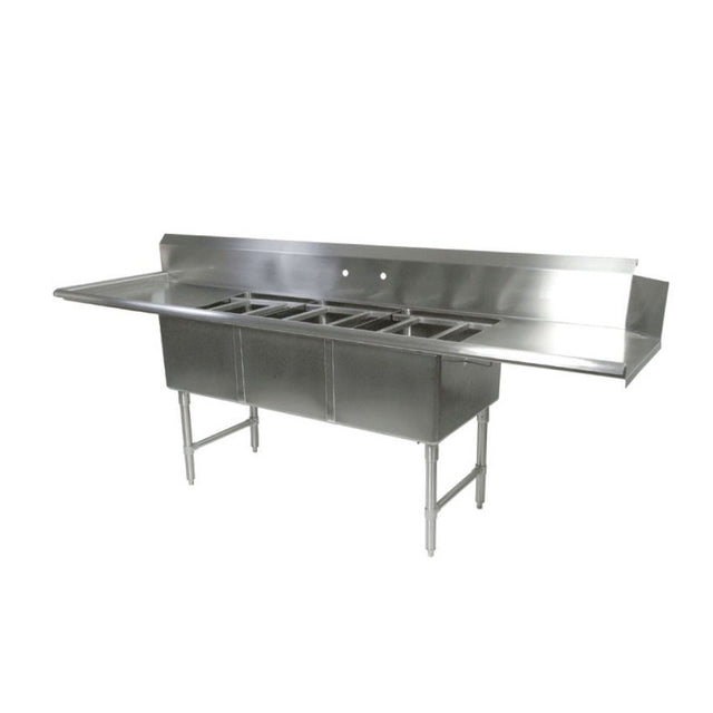 John Boos' Straight-Clean Dishtable/Pot Sinks, 91-1/2"W x 30"D, straight design, (3) 18"W x 24" front to back, 14" deep compartments, (2) 18" drainboards, dish machine attachment on right side, 10"H boxed backsplash, (3) rack slides with storage bracket, 16/300 stainless steel, stainless steel legs & bracing. 3B18244 W/18"DB LEFT POT SINK
