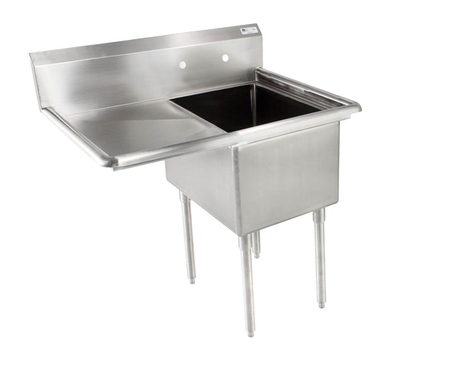 One-compartment sink. 18 Gauge 300 series stainless steel bowl and deck. Galvanized legs and plastic bullet feet. Bowl measures 24" length by 24" width by 14" depth. Measures 50-1/2" Length by 29-1/2" Width. 1 COMPARTMENT 24X24X14D W/24DB LEFT