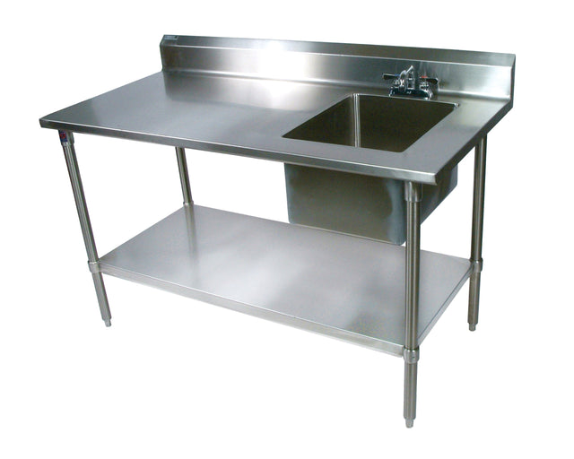Prep table with right hand side sink bowl. Made of 16 Gauge 300 series stainless steel material. Includes 4" deckmount faucet and 10" spout. Adjustable galvanized undershelf. Sink measures 16" length by 20" width by 12" depth. NSF Approved. Measures 60" length by 30" width. PREP TABLE 60X30 W/5"CLIP-DOWN RSR