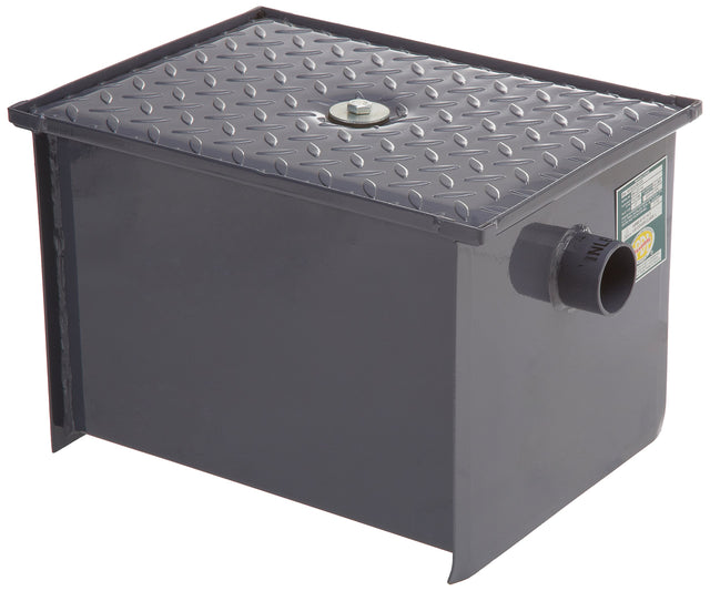 Grease traps are designed for removing and isolating Fat, Oil and Grease (F.O.G) from drainage water. This Commercial Grade Grease Trap is constructed of TIG welded 11 gauge (1/8 inch thick) carbon steel with a corrosion resistant coating. It features a non skid cover (deck plate) and removable baffle, which makes maintanence easy and accessible. The cover also features a locking device to ensure lid stays securely closed. Both Ends of the Grease Interceptor accept no-hub adapters for steel or plastic. The T-Vent Pipe Flow Control Tee is included. Certified by the Plumbing and Drainage Institute. John Boos Grease Traps are available in a variety sizes, ranging from 8 to 100 pound capacities. GREASE TRAP 14# CAPACITY