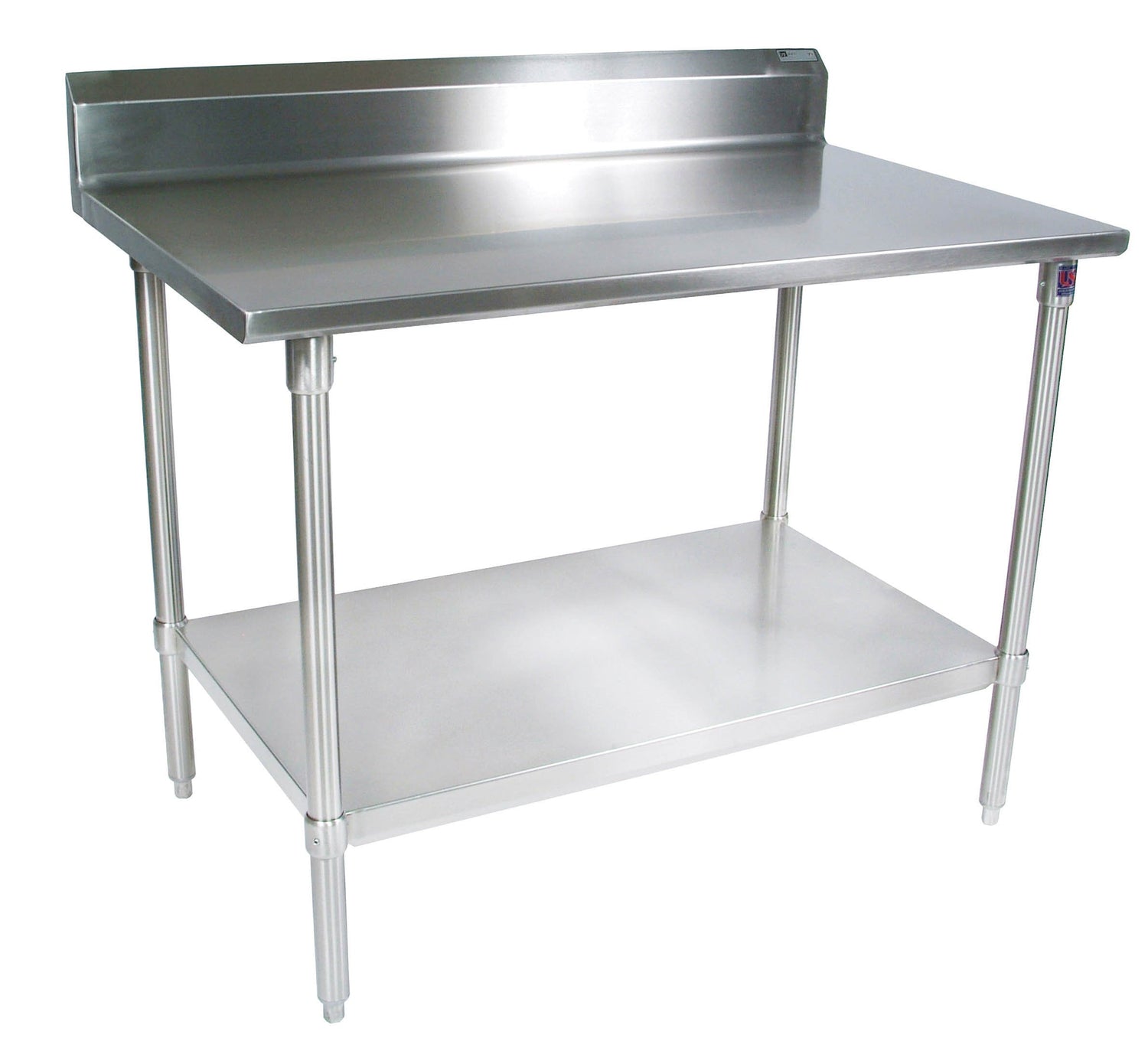 This John Boos work table comes with a thick, sturdy 14 gauge stainless steel top with 5inch riser. The base’s bracing and under shelf are composed of 14 gauge galvanized steel so that these work tables are as sturdy as they are stylish. These tables come with adjustable bullet feet for use on uneven surfaces and are perfect for use in commercial, institutional - and even residential - kitchens. This table is built to comply with the National Sanitation Foundation NSF/ANSI Stand 2 for food equipment. It ships knocked down, but is easy to assemble. Tools for assembly are sold separately. 48" x 36". 14GA 48X36 5"BS W/ADJ GALV SHF KD