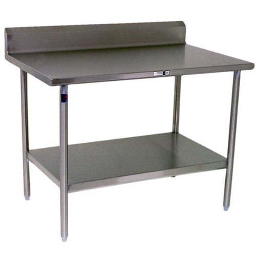 A work table with a 72'' width x 36'' depth by John Boos featuring a 14/300 stainless steel top with 5'' backsplash and turndown, a front stallion safety edge, a 90 degree turndown on sides, galvanized legs and adjustable undershelf, kd, and is NSF listing. 14GA 72X36 5"BS W/ADJ GALV SHF KD