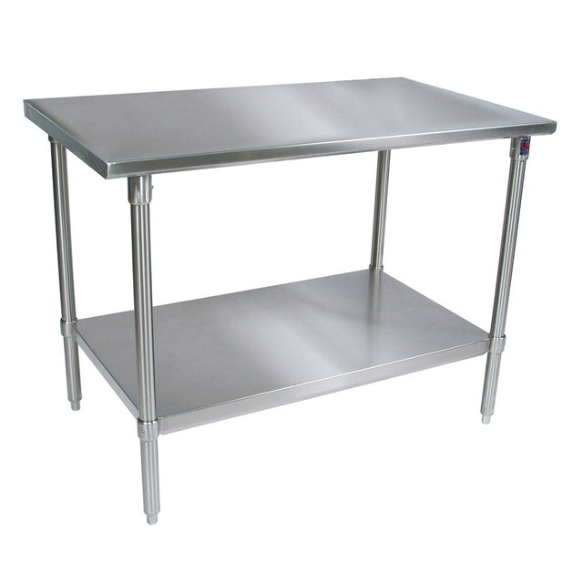 A work table with a 72'' width x 36'' depth by John Boos featuring a 16/300 stainless steel flat top with a front stallion safety edge and back, a 90 degree turndown on sides, stainless steel legs and adjustable undershelf, kd, and is NSF listing. 16GA 72X36 FLAT W/ADJ SS SHF KD
