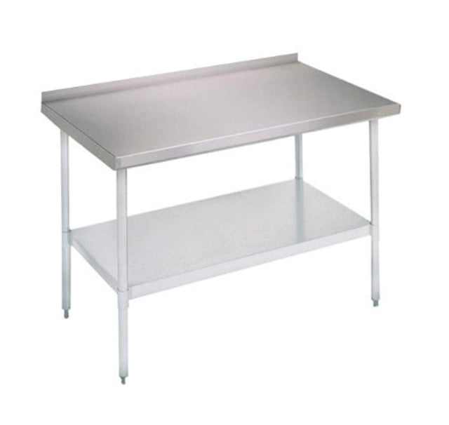 E-Series budget work table with galvanized Legs. Stallion edge both faces, straight turn down on sides. 1-1/2" Turn up rear riser top table. Shipped knocked-down, easy-to-assemble. All models are approved by the National Sanitation Foundation and the U.S. department of agriculture. Stainless steel tops are TIG welded, exposed welds are polished to match adjacent surface. Materials - top: 18 gauge stainless steel, type 430 stainless steel mechanically polished, satin finish, shelf: 18 gauge galvanized steel, legs: 1-5/8" round outside diameter, 16 gauge tubular galvanized steel, gussets: galvanized steel, feet: 1" adjustable plastic bullet feet. Measures 60" length by 30" width. 60X30 T-430 SS TBL W/1-1/2" BS