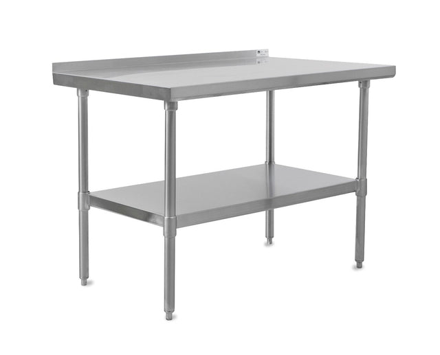 E Series budget work table with stainless steel Legs. Stallion edge both faces, straight turn down on sides. 1-1/2" Turn up rear riser top table. Stainless legs and adjustable undershelf. Shipped knocked-down, easy-to-assemble. All models are approved by the National Sanitation Foundation and the U.S. department of agriculture. Stainless steel tops are TIG welded, exposed welds are polished to match adjacent surface. Materials - top: 18 gauge stainless steel, type 430 stainless steel mechanically polished, satin finish, feet: 1" adjustable plastic bullet feet. Measures 36" length by 30" width. 36X30 18GA T-430 1-1/2 BS