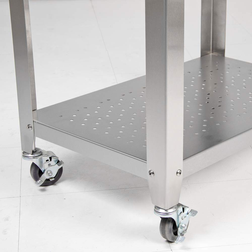 This Walnut Cucina Elegante cart from John Boos features an American Black Walnut blended edge grain top with varnique finish. It has 2 food service grade stainless steel shelves with the middle shelf being reversible.Model #: WAL-CUCE301.5" thick American Black Walnut blended edge grain top2 stainless steel shelvesReversible middle shelfDovetailed drawer with stainless steel frontTowel barStainless steel legsCommercial grade 3" locking casters BLENDED WALN ELEGANTE 30.75X20X1.5"