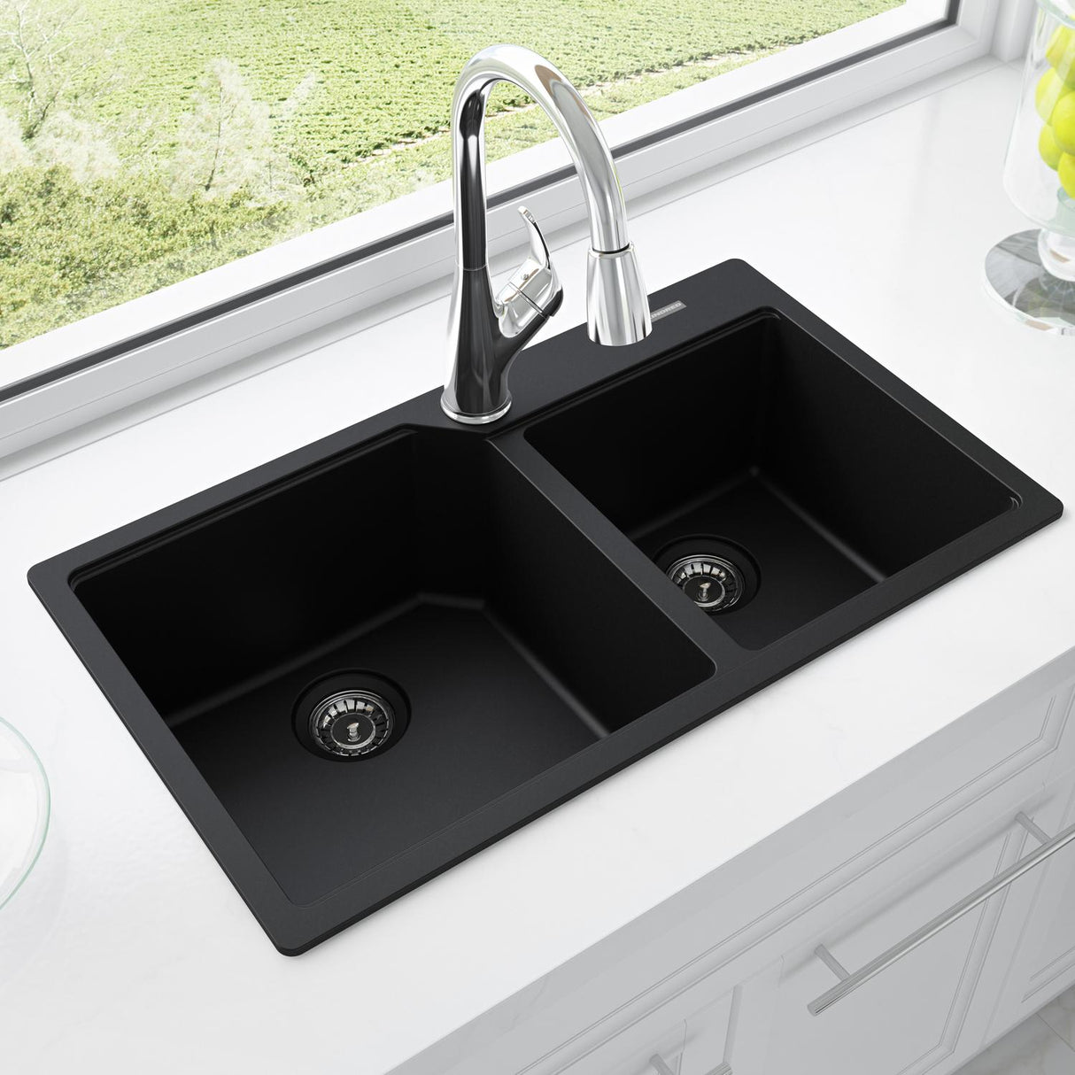 KINDRED MGCM2034-9ONN Granite Series 33.88-in LR x 19.69-in FB x 9.06-in DP Drop In Double Bowl Granite Kitchen Sink In Onyx