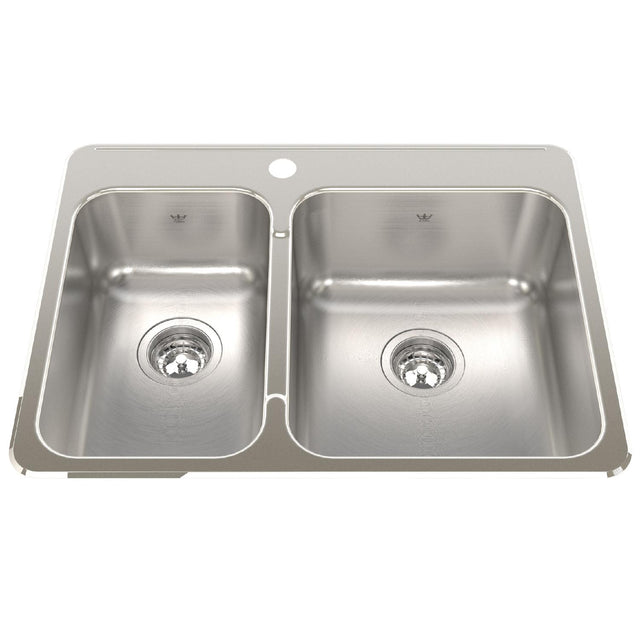 KINDRED QCLA2027L-8-1N Steel Queen 27.25-in LR x 20.56-in FB x 8-in DP Drop In Double Bowl 1-Hole Stainless Steel Kitchen Sink In Satin Finished Bowls with Mirror Finished Rim