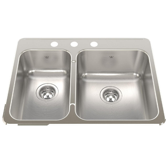 KINDRED QCLA2027L-8-3N Steel Queen 27.25-in LR x 20.56-in FB x 8-in DP Drop In Double Bowl 3-Hole Stainless Steel Kitchen Sink In Satin Finished Bowls with Mirror Finished Rim