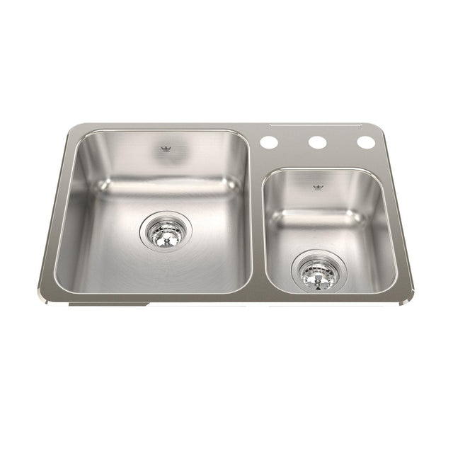 KINDRED QCMA1826-7-3N Steel Queen 26.5-in LR x 18.13-in FB x 7-in DP Drop In Double Bowl 3-Hole Stainless Steel Kitchen Sink In Satin Finished Bowls with Mirror Finished Rim