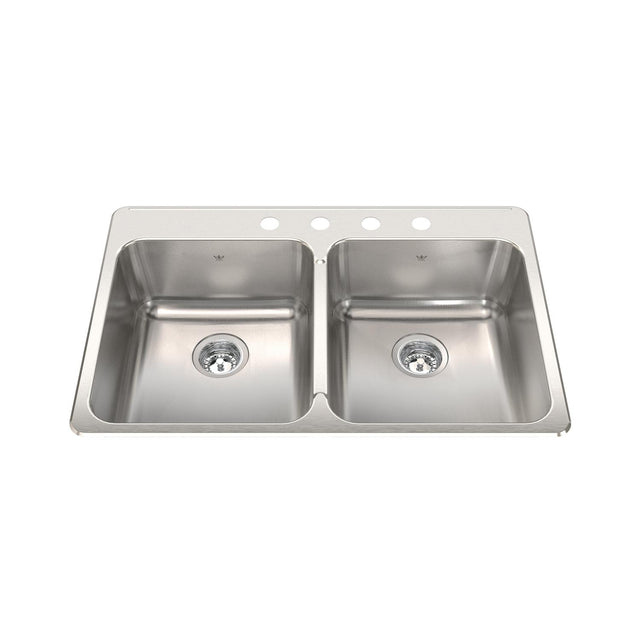 KINDRED QDLA2233-8-4N Steel Queen 33.38-in LR x 22-in FB x 8-in DP Drop In Double Bowl 4-Hole Stainless Steel Kitchen Sink In Satin Finished Bowls with Mirror Finished Rim