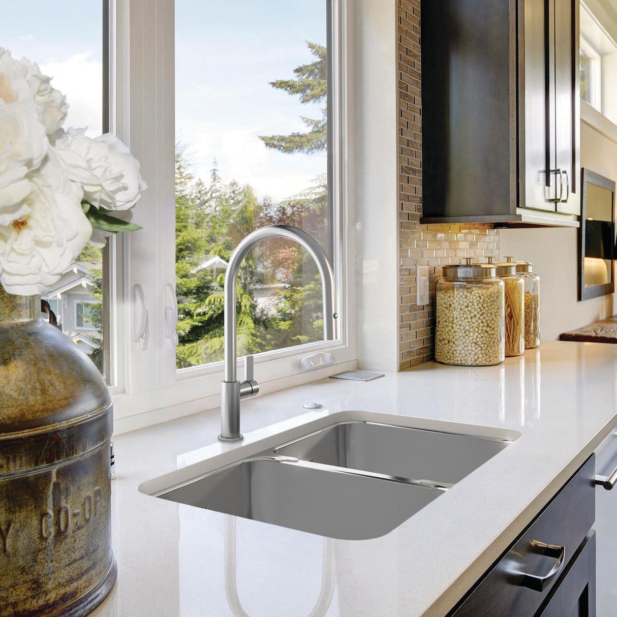 KINDRED QDUA1831-8N Steel Queen 30.88-in LR x 17.75-in FB x 8-in DP Undermount Double Bowl Stainless Steel Kitchen Sink In Satin Finished Bowls with Silk Finished Rim