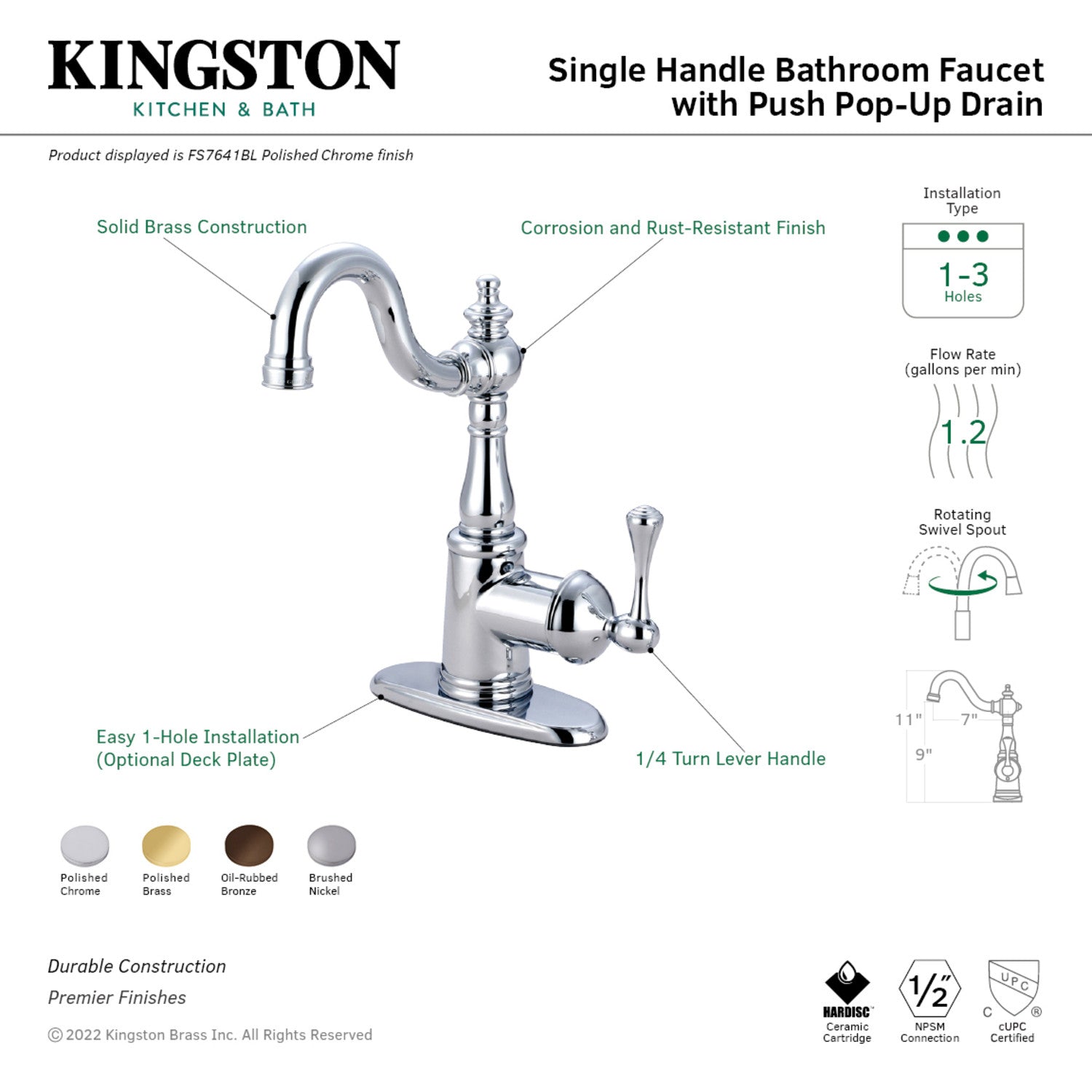 Honor the refinement of antiquated traditional European craftsmanship with this faucet. Single-hole bathroom faucets provide a more streamlined look. Also, they will allow your bathroom to appear more spacious with the limited counter space they require. The English Vintage single-handle bathroom faucet with push pop-up and its featured sturdy brass construction and premium polished brass finish are guaranteed to glamorize your home's traditional ensemble for years to come. This faucet will surely raise praise and admiration for its unique aesthetic. A matching finish drain is also included.