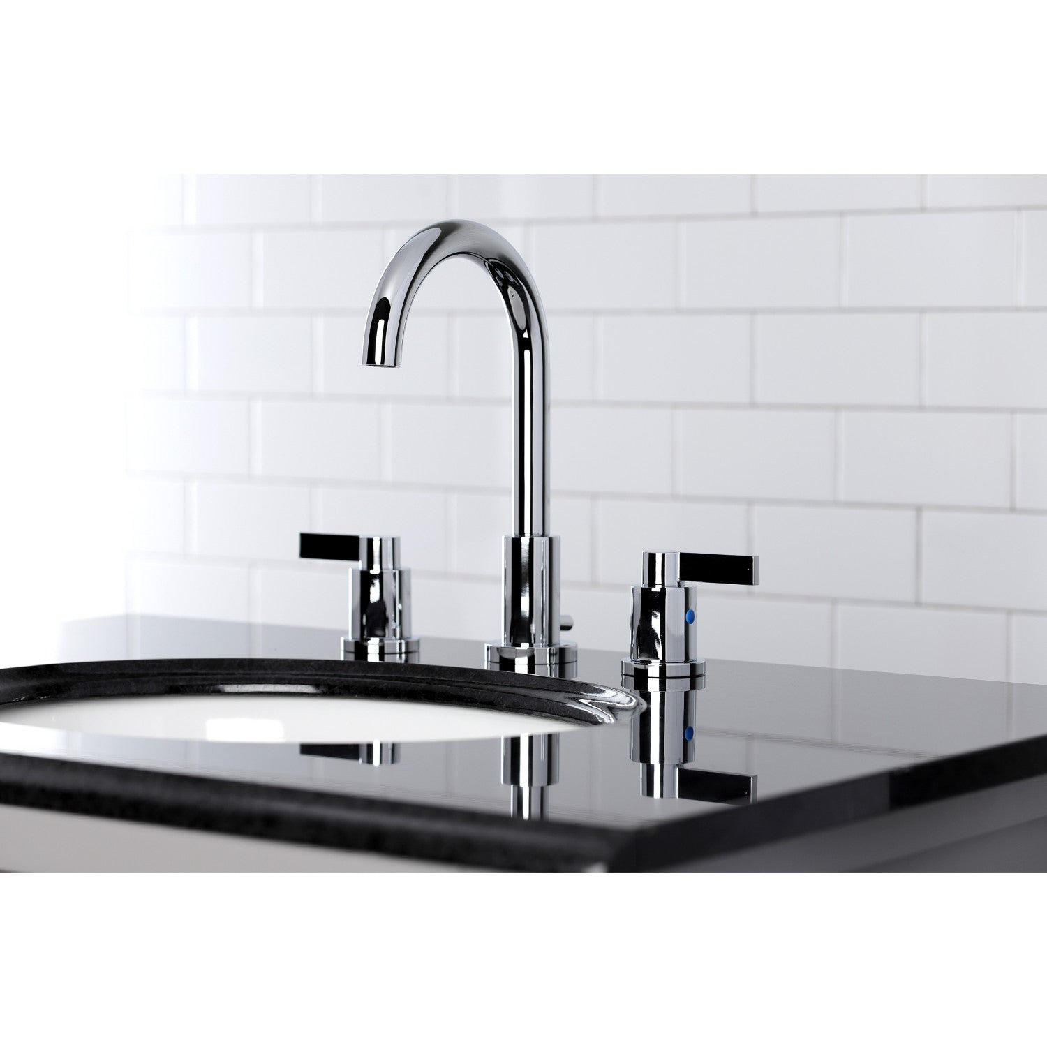 The chic fashion of this faucet is distinguished by its expressive artistry and flat, ergonomic levers. Ideal for more spacious bathrooms, widespread faucets are more spread apart and feature a 3-hole installation. The NuvoFusion 8 in. widespread bathroom faucet with brass pop-up and its featured sturdy brass construction and premium polished chrome finish are guaranteed to glamorize your home's modern ensemble for years to come. Revive the obsolete with the illustrious prestige of this fixture. A matching finish drain is also included.
