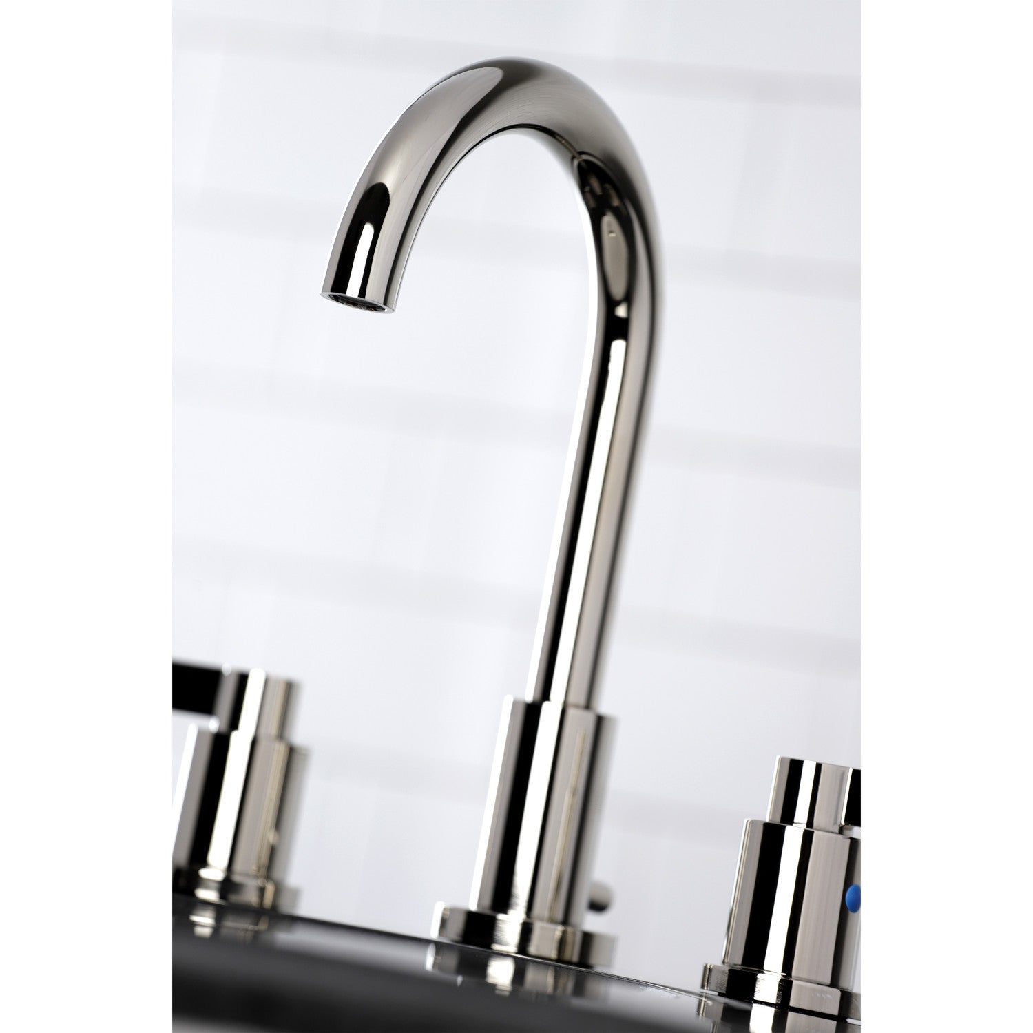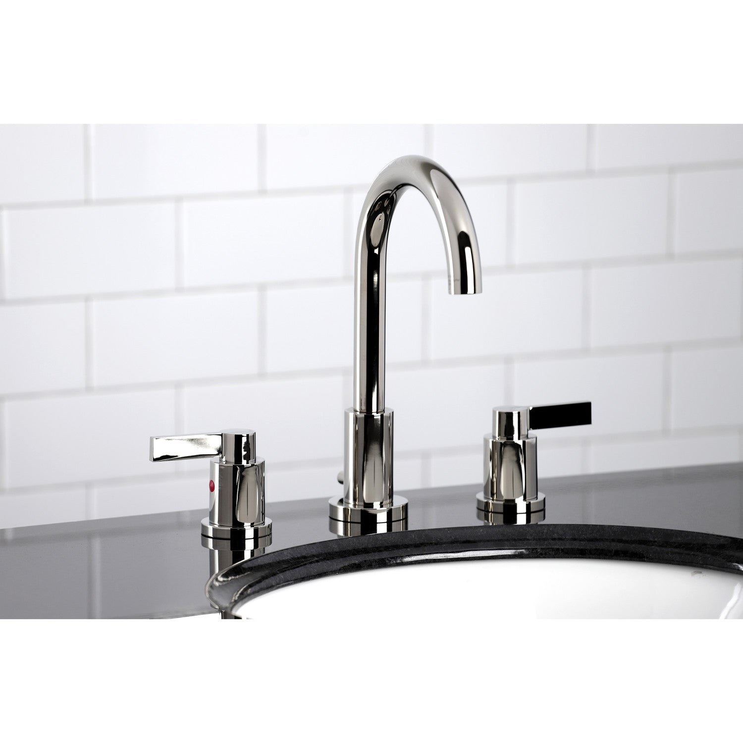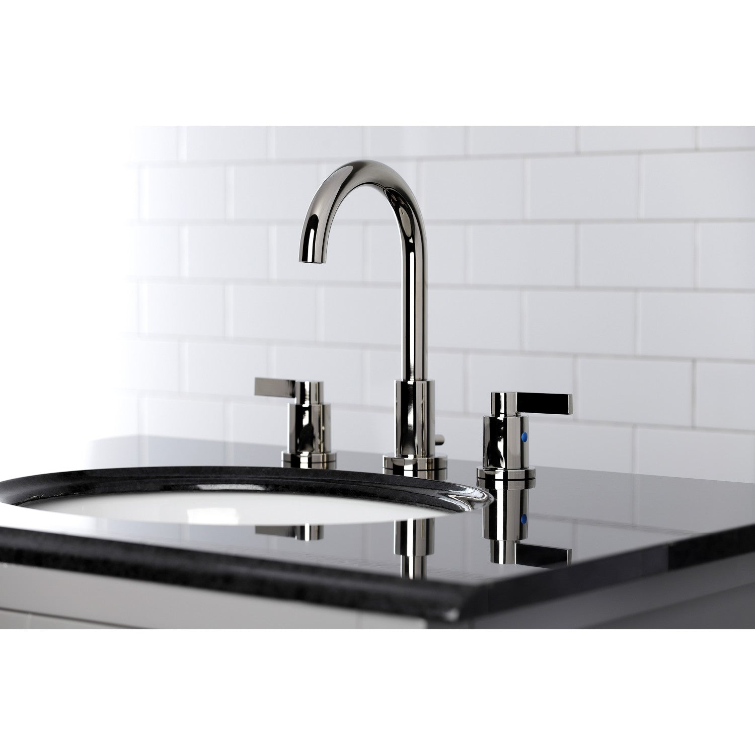 The chic fashion of this faucet is distinguished by its expressive artistry and flat, ergonomic levers. Ideal for more spacious bathrooms, widespread faucets are more spread apart and feature a 3-hole installation. The NuvoFusion 8 in. widespread bathroom faucet with brass pop-up and its featured sturdy brass construction and premium polished nickel finish are guaranteed to glamorize your home's modern ensemble for years to come. Revive the obsolete with the illustrious prestige of this fixture. A matching finish drain is also included.