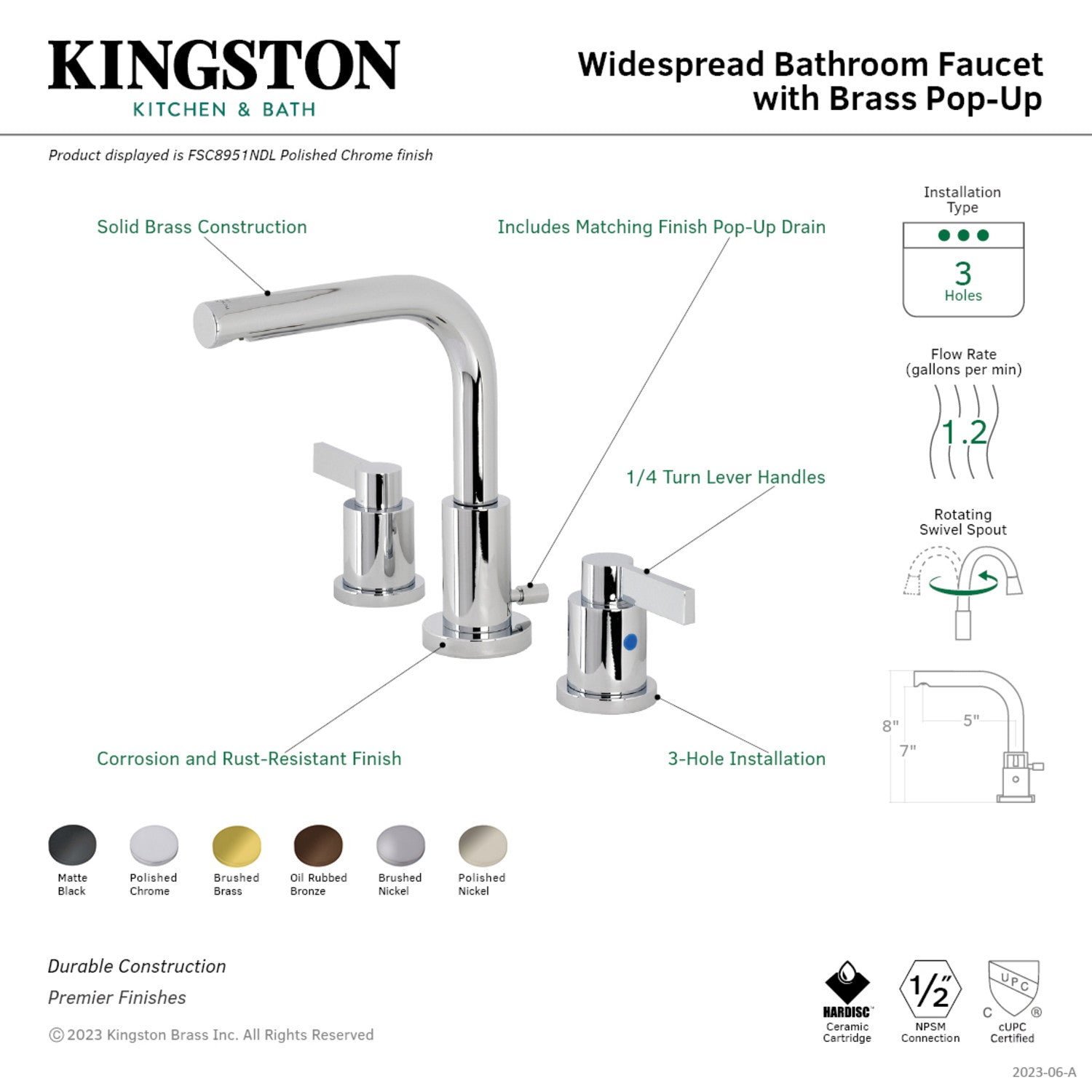 The chic fashion of this faucet is distinguished by its expressive artistry and flat, ergonomic levers. Ideal for more spacious bathrooms, widespread faucets are more spread apart and feature a 3-hole installation. The NuvoFusion 8-inch widespread bathroom faucet with brass pop-up and its featured sturdy brass construction and premium polished nickel finish are guaranteed to glamorize your home's modern ensemble for years to come. Revive the obsolete with the illustrious prestige of this fixture. A matching finish drain is also included.