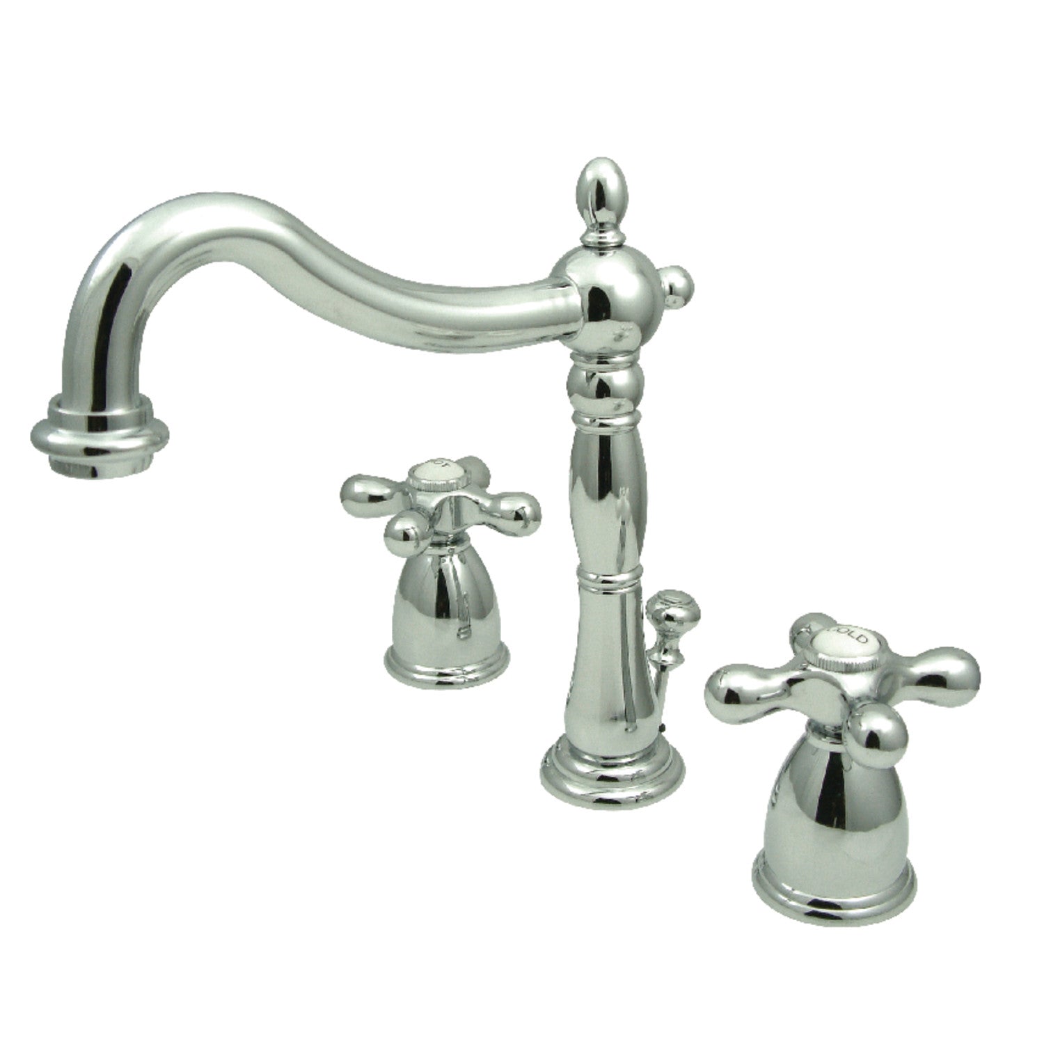 A lavish spark of traditionally stylized glamour is brought to your bathroom ensemble with this beautiful faucet. Ideal for more spacious bathrooms, widespread faucets are more spread apart and feature a 3-hole installation. The Heritage 8-inch widespread bathroom faucet and its featured sturdy brass construction and premium polished chrome finish are guaranteed to glamorize your home's traditional ensemble for years to come. Celebrate sophistication and traditional decor with this statement piece. A matching finish drain is also included.