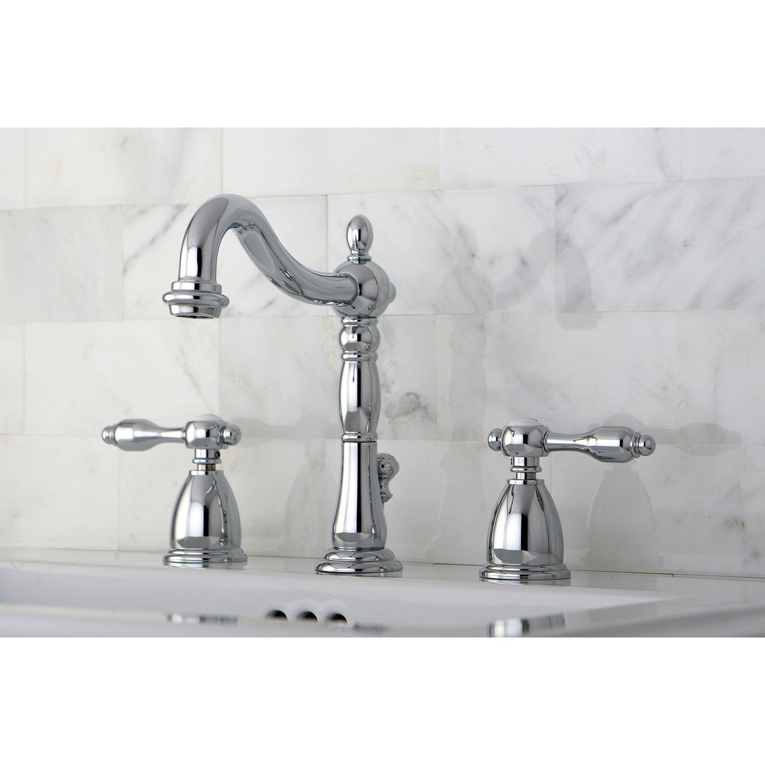 Offering a nod toward the past, this faucet is beautifully inspired by the vintage elegance of mid-19th Century design. Ideal for more spacious bathrooms, widespread faucets are more spread apart and feature a 3-hole installation. The Tudor widespread bathroom faucet and its featured sturdy brass construction and premium polished chrome finish are guaranteed to glamorize your home's traditional ensemble for years to come. A unique and classically enchanting personality is embodied in this centerpiece. A matching finish drain is also included.