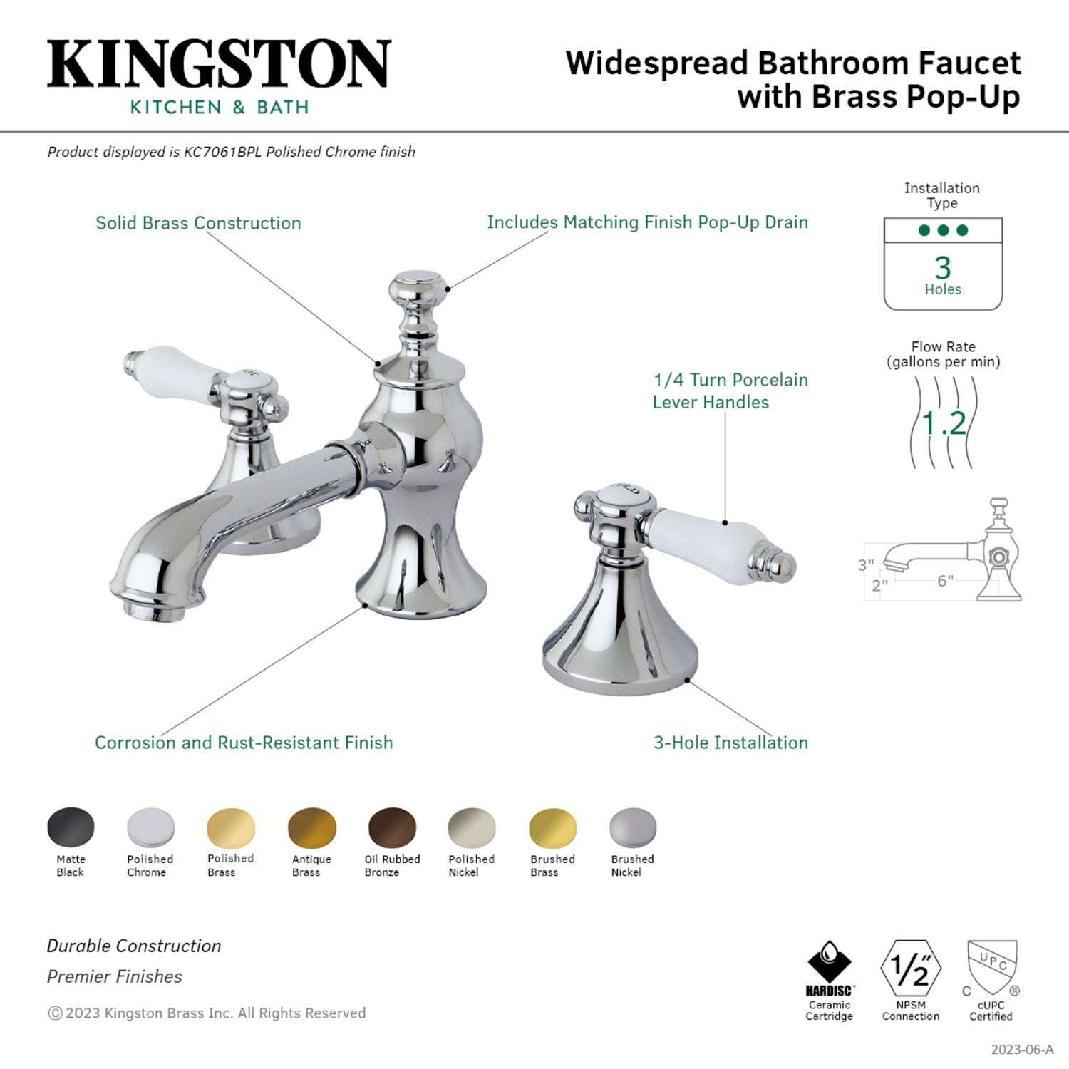 The graceful elegance of timeless design is beautifully merged between British flair and Victorian delicacy within this faucet's white porcelain levers. Ideal for more spacious bathrooms, widespread faucets are more spread apart and feature a 3-hole installation. The Bel-Air 8-inch widespread bathroom faucet with brass pop-up and its featured sturdy brass construction and premium polished chrome finish are guaranteed to glamorize your home's traditional ensemble for years to come. Varnish your bathroom with this state-of-the-art fixture. A matching finish drain is also included.