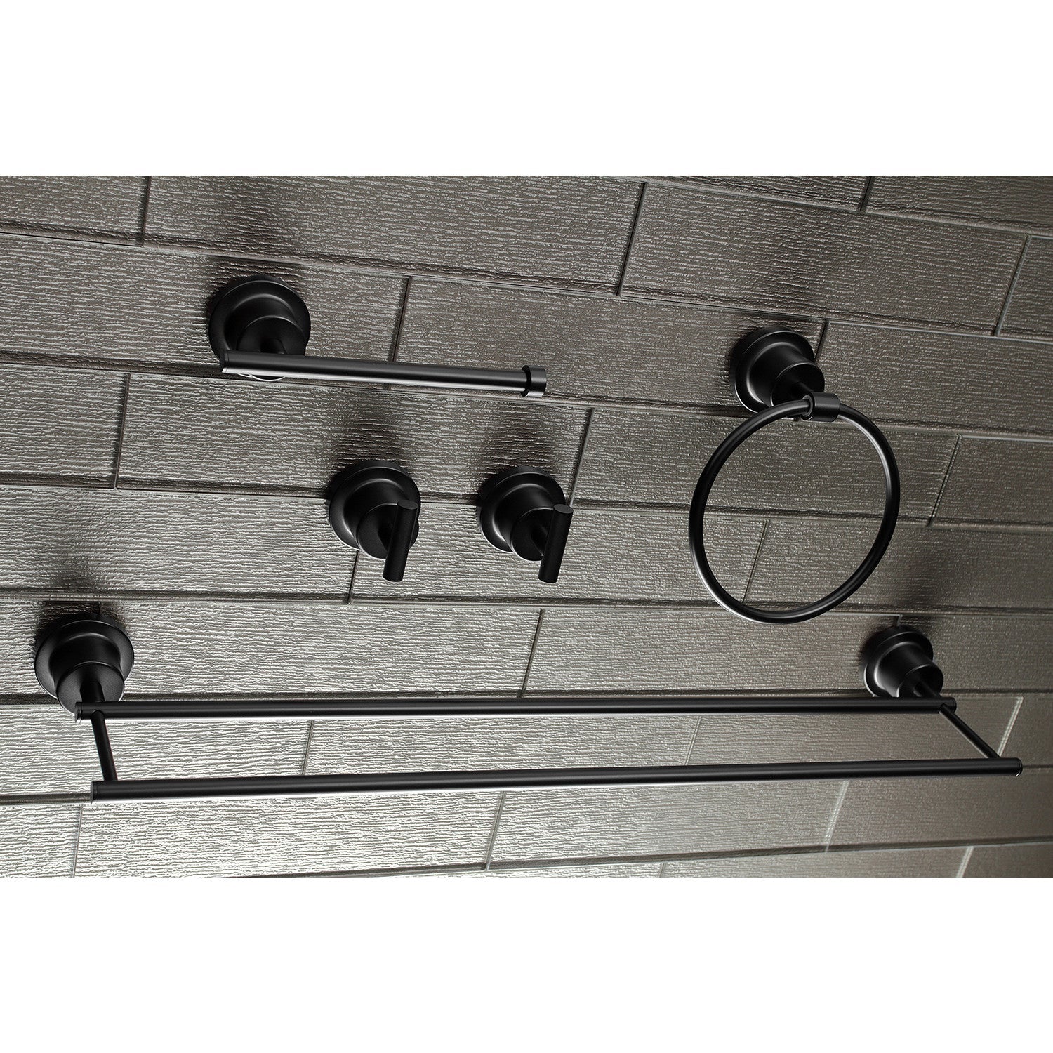 - Contemporary 5-piece bathroom accessory combo includes 24-inch double towel bar, towel ring, toilet paper holder and 2 robe hooks