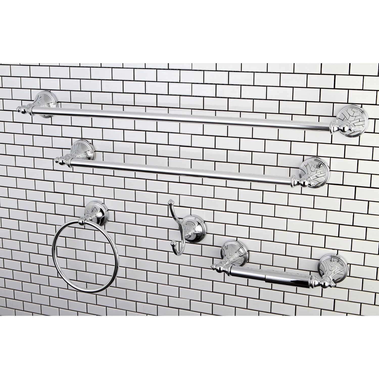 This all inclusive set of bathroom accessories features intricate detailing for a luxurious and astonishing style. Any bathroom will be given an added boost of opulence from these coordinated pieces. Two towel bars, robe hook, towel ring, and a toilet paper holder are included for all of your hanging storage needs. Available in multiple, durable finishes.