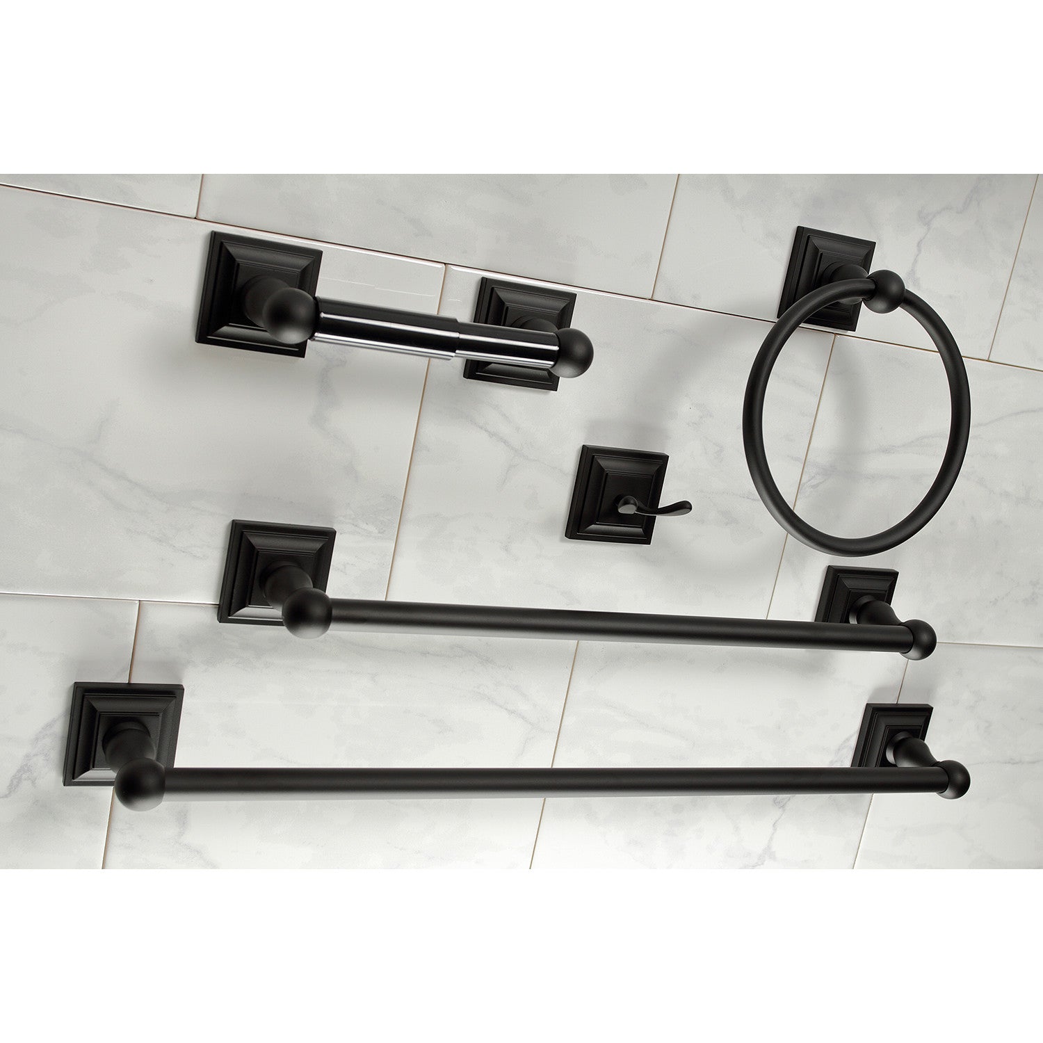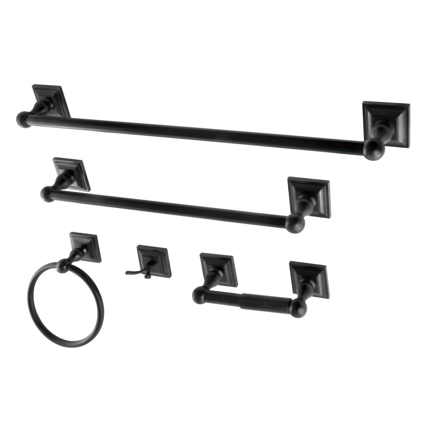 - 5-piece bath hardware set includes 18-inch towel bar, 24-inch towel bar, towel ring, and toilet paper holder and robe hook