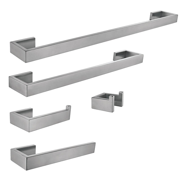 - Set includes 24-inch towel bar, 18-inch towel bar, towel holder, paper holder, and robe hook
