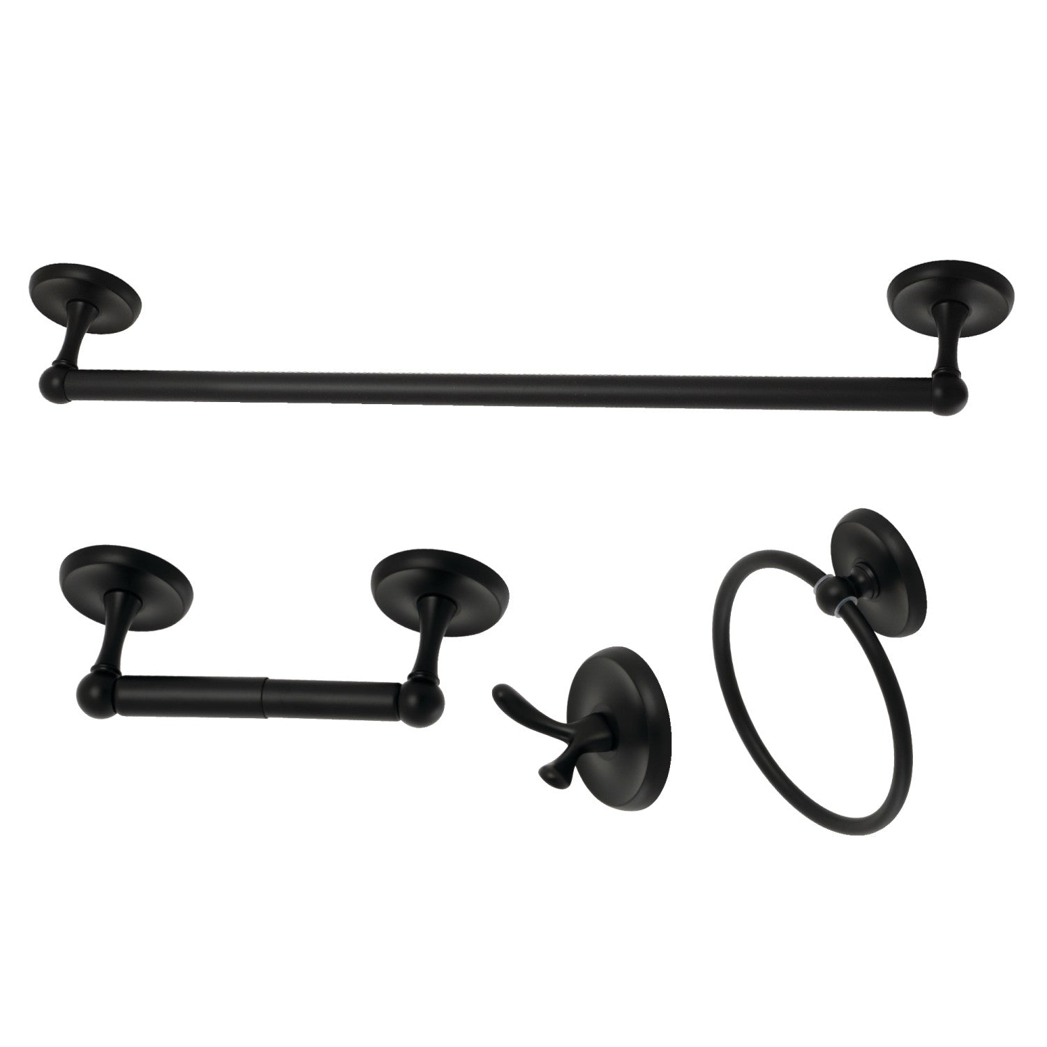 - 4 piece bathroom accessory kit includes: 18" towel bar, towel ring, robe hook and toilet paper holder
