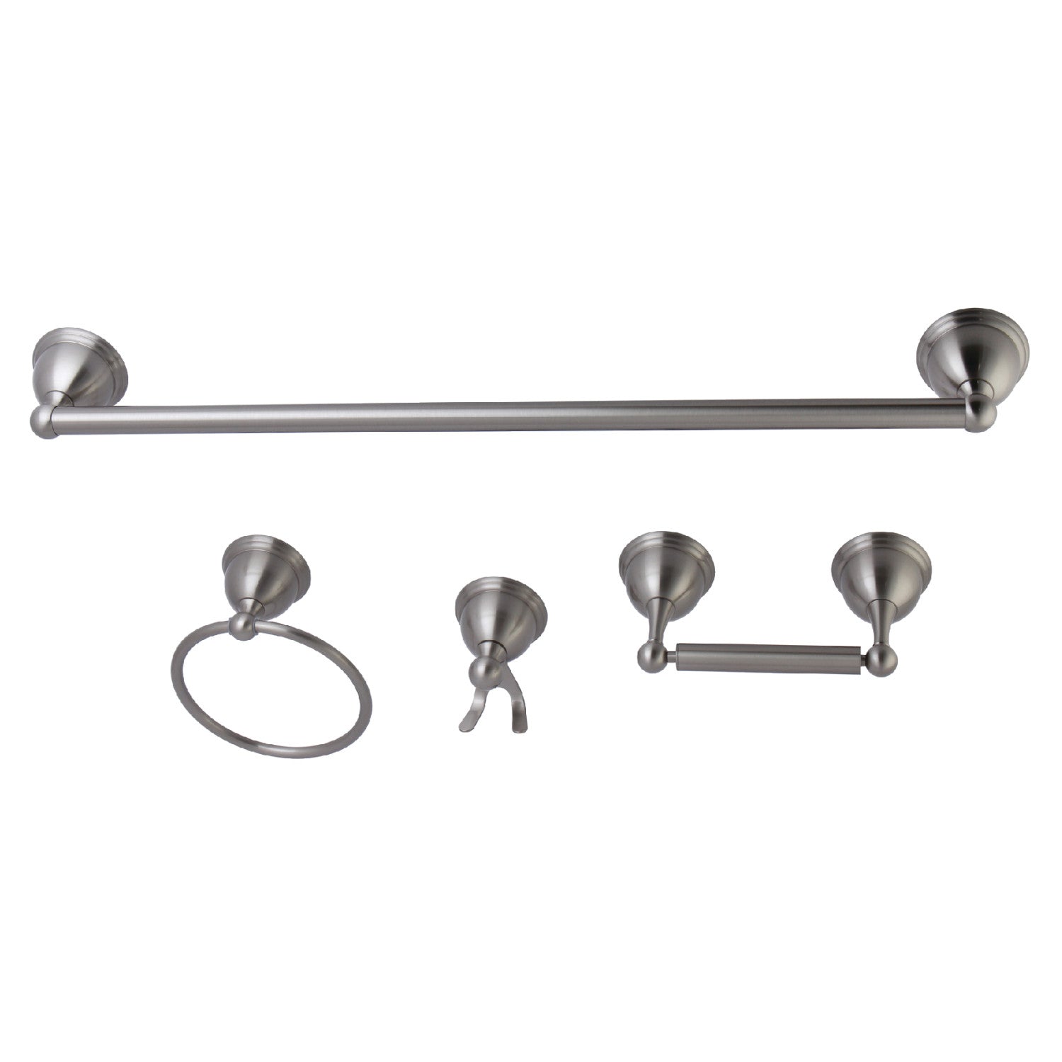 - 4 piece set includes: 24" towel bar, towel ring, robe hook, and toilet paper holder