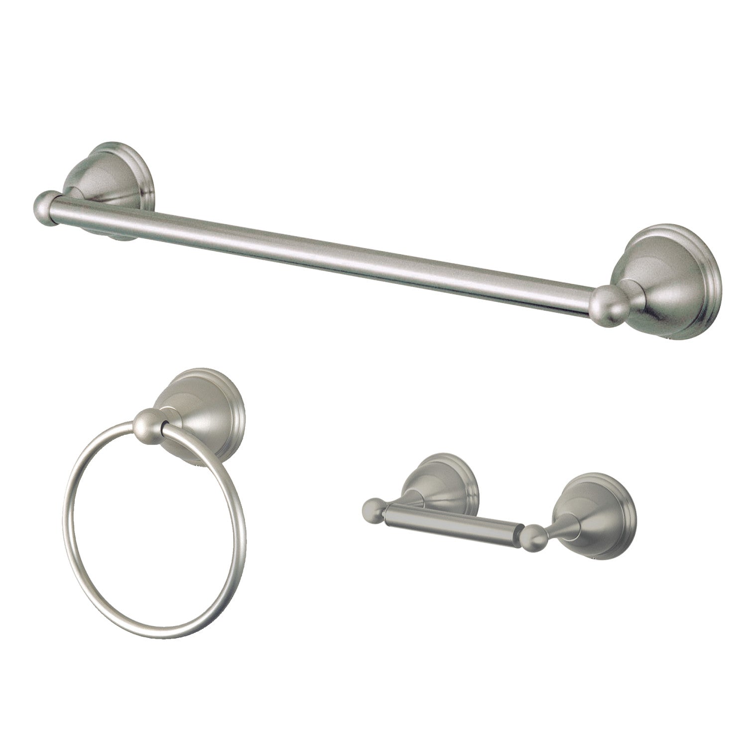 - 3 piece set includes: 18" towel bar, towel ring, toilet paper holder