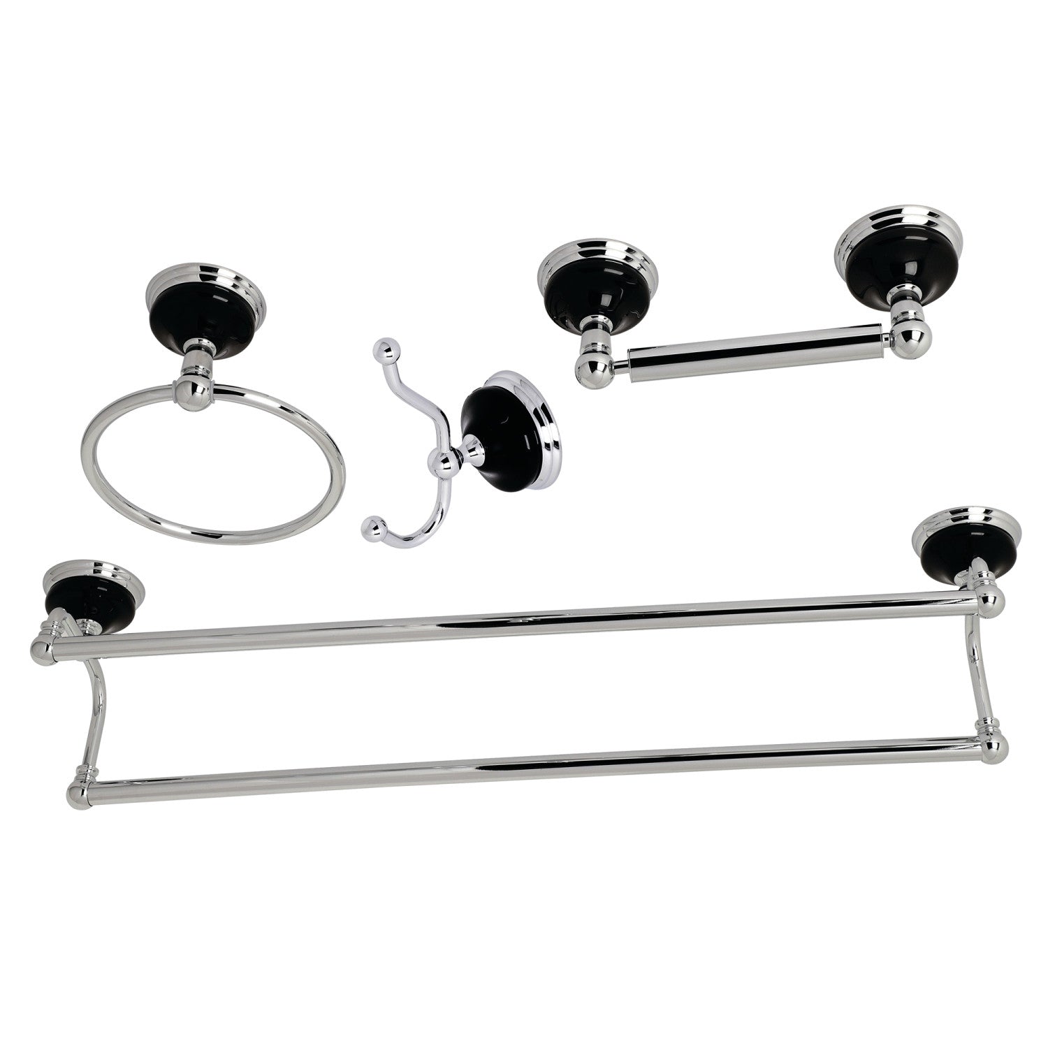 - Set includes 24" dual towel bar, towel ring, toilet paper holder, robe hook.