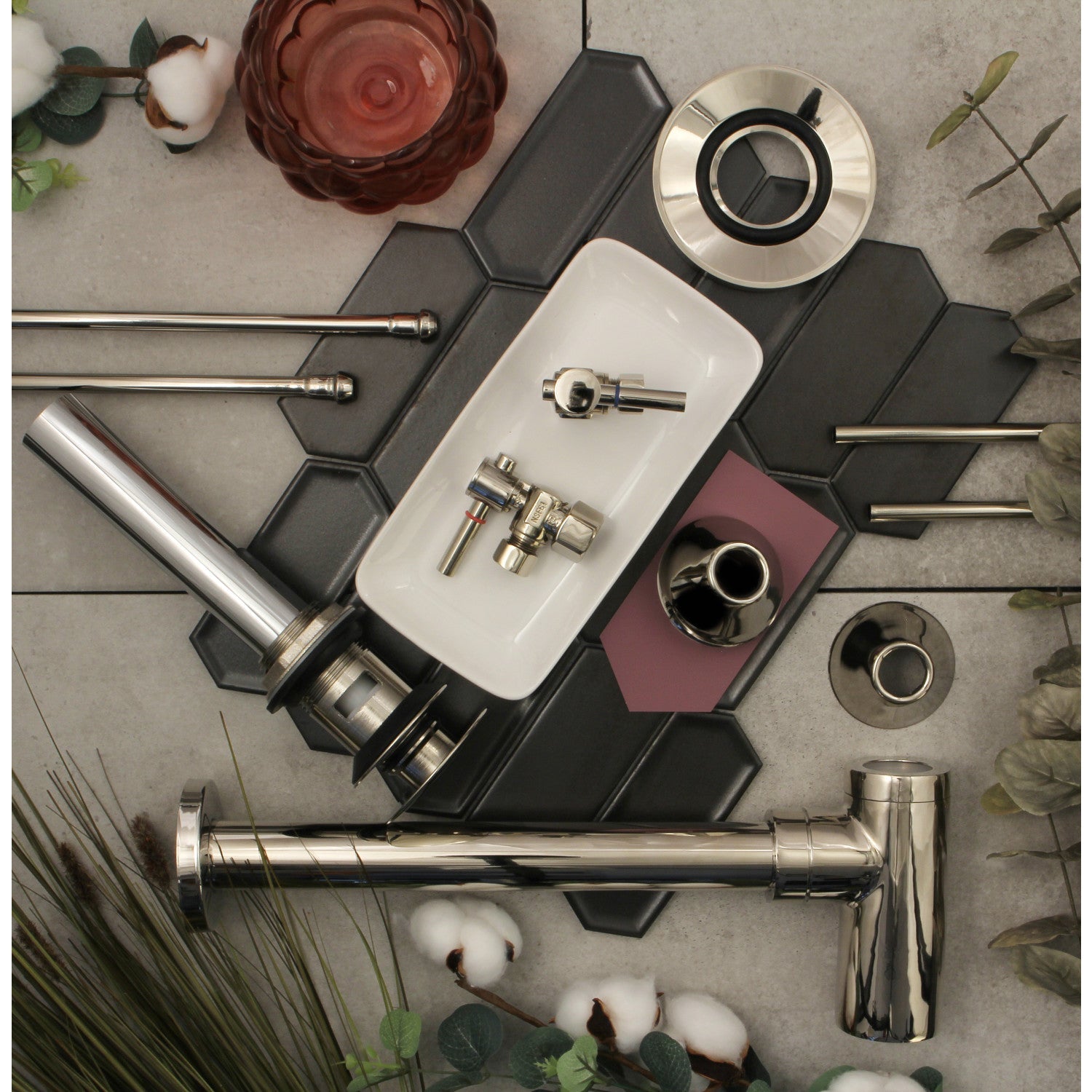 This contemporary style vessel sink plumbing kit consists of all the necessary components for installing a waste water draining system. The parts included are single handle 1/2" IPS angle stops, 30" bullnose lavatory supply lines, 1/2" IPS bell flanges, a 13-7/8" bottle-trap and a drain with mounting rain. Constructed of high quality material and a tarnish-resistant finish, designed for long-lasting performance. Available in a variety of stunning finishes ready to match any home decor.